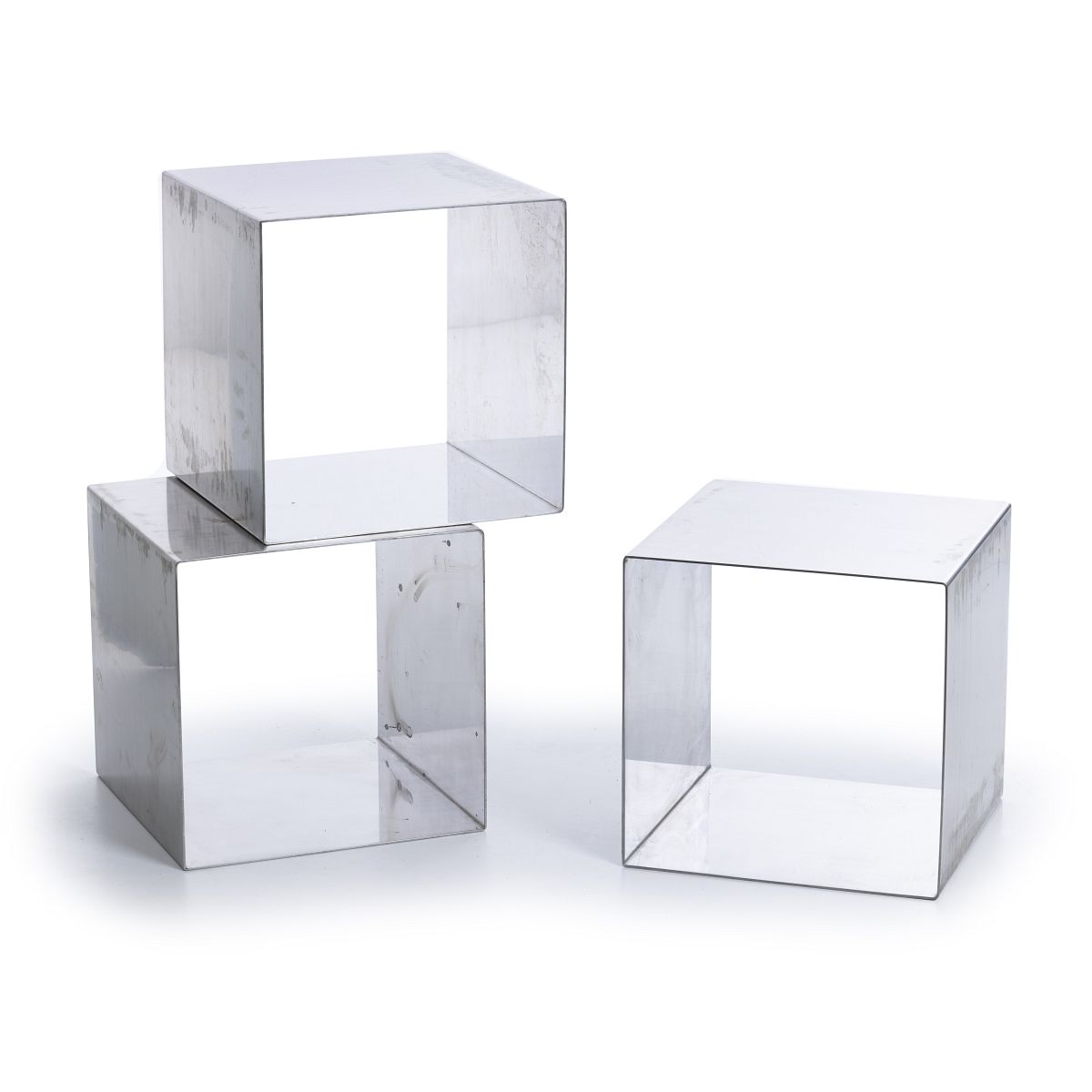 França, c.1968, três módulos / mesas de apoio em aço inoxidável. Vide DEMISCH / DANANT - 'Maria Pergay - Complete Works'. Dim.: 36x36x36 cm.