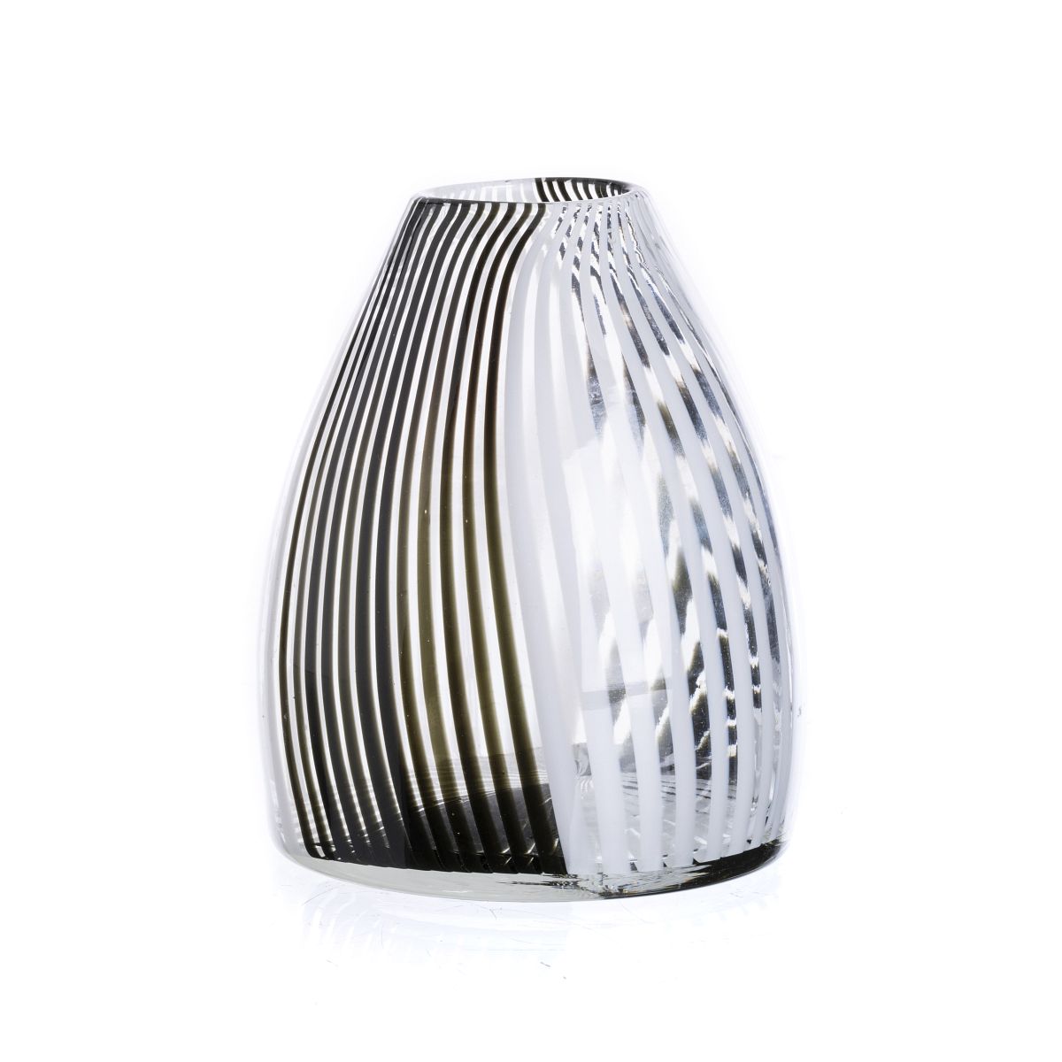 Italia, c.1990, vidro Murano transparente com bandas verticais a branco e negro. Sinais de uso. Dim.:16cm.