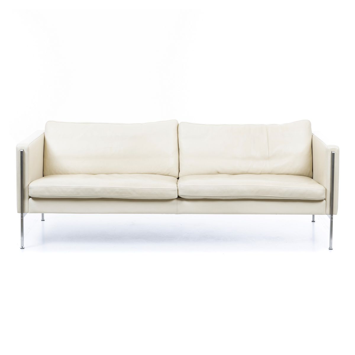 Dinamarca, c.1990, sofá de três lugares, estrutura em aço cromado, estofo em pele cor bege, marcado 'Skipper Furniture'. Dim.: 75x202x83 cm.