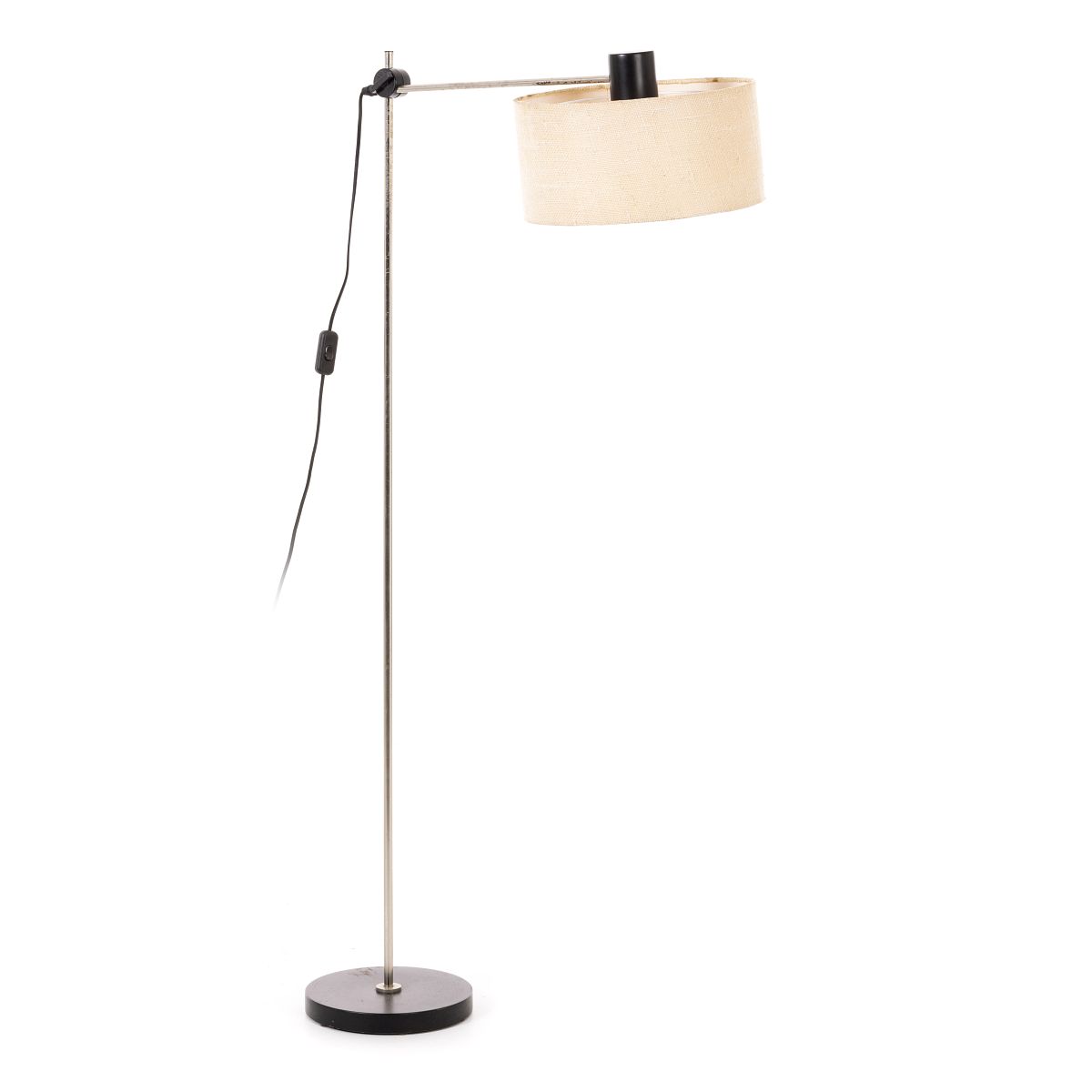 Alemanha, c.1970 em metal cromado e lacado a preto, ajustável em altura, abatjour em tecido. Oxidação. Dim.:150cm.
