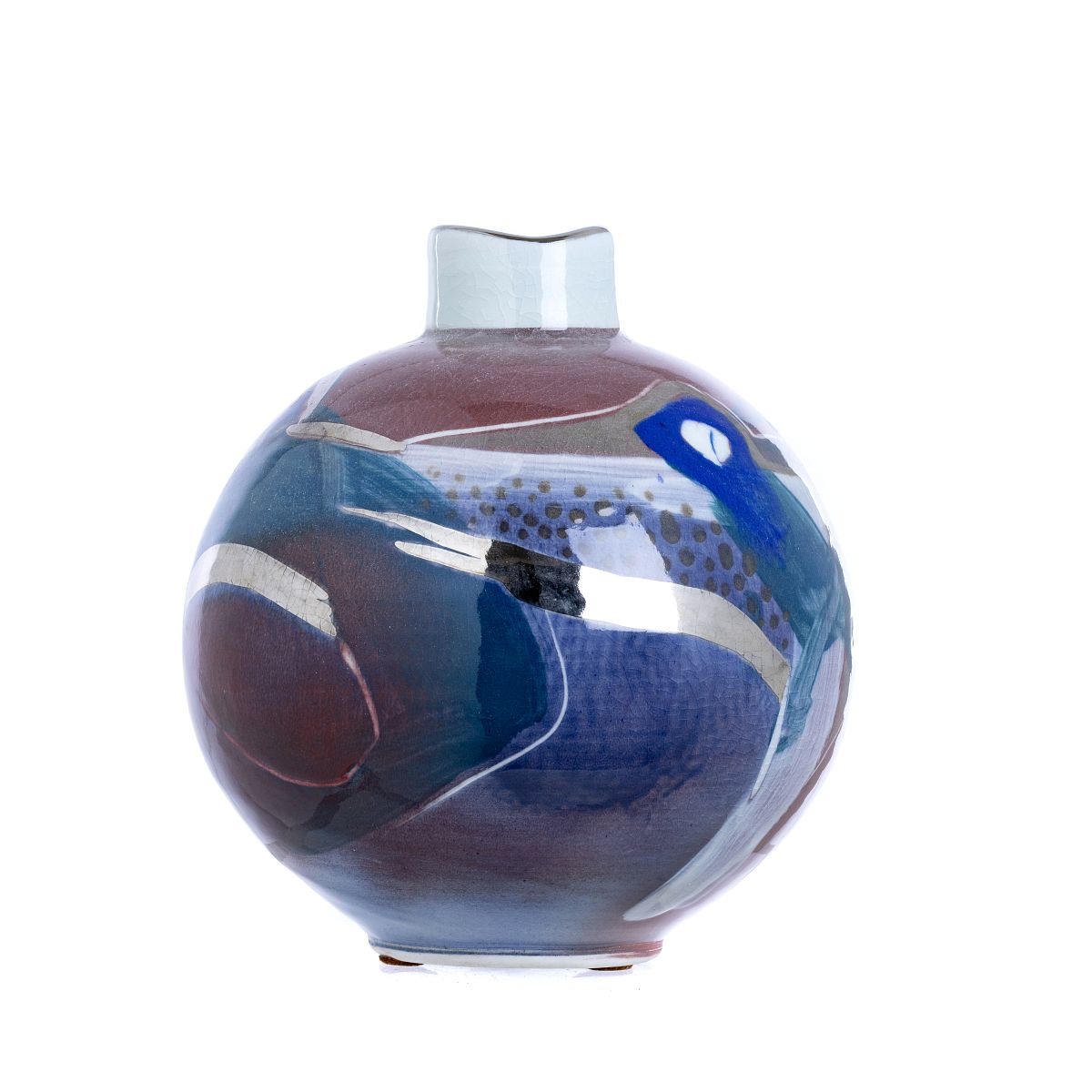 França, c.1970-80, forma bojuda, grés porcelânico de grande fogo, decoração polícroma e a prata. Assinado a carimbo na base. Dim.: 27 cm.