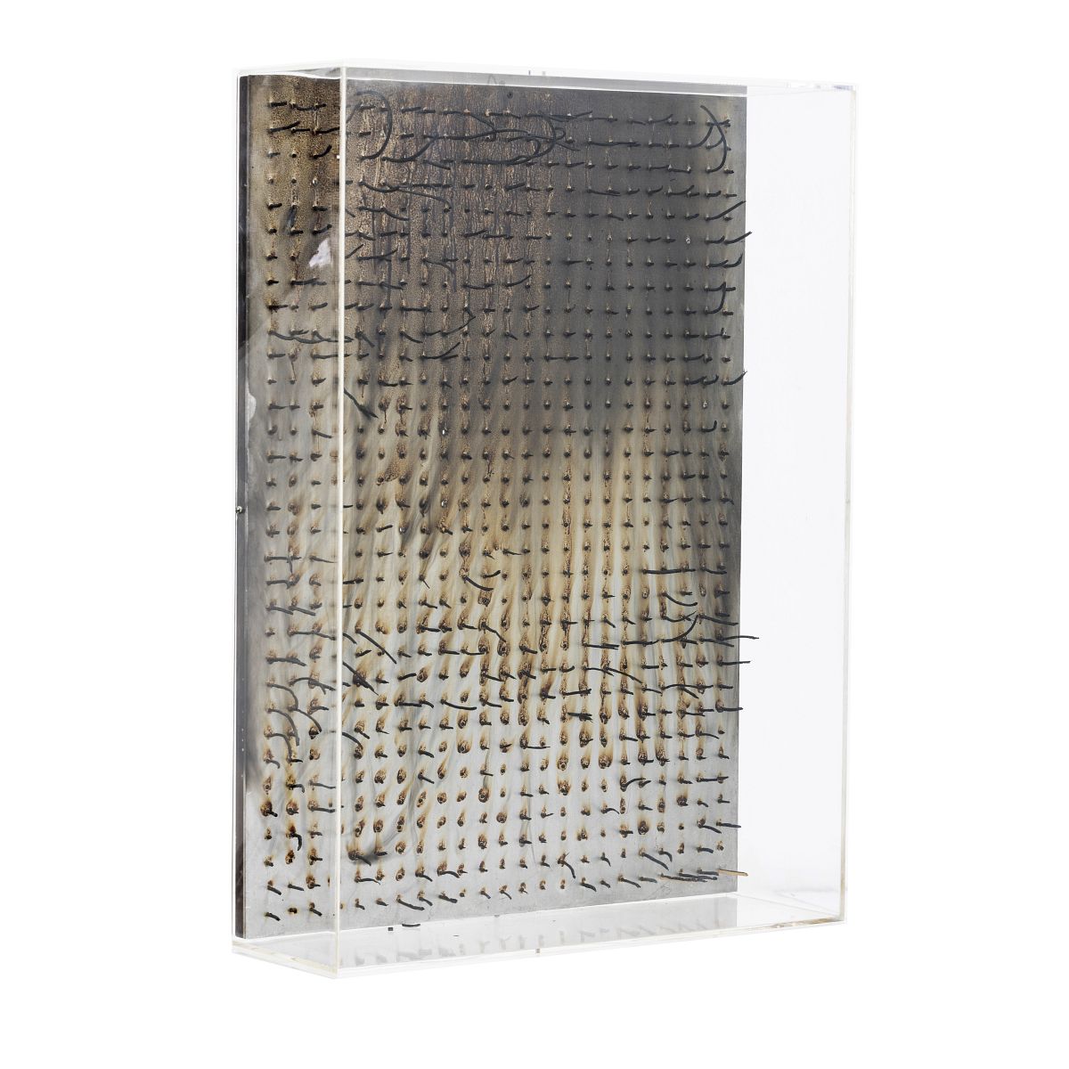 Fósforos queimados em placa de alumínio, caixa em madeira e acrilico. Assinado e datado de 1974 no verso. Dim.: 70x50 cm.