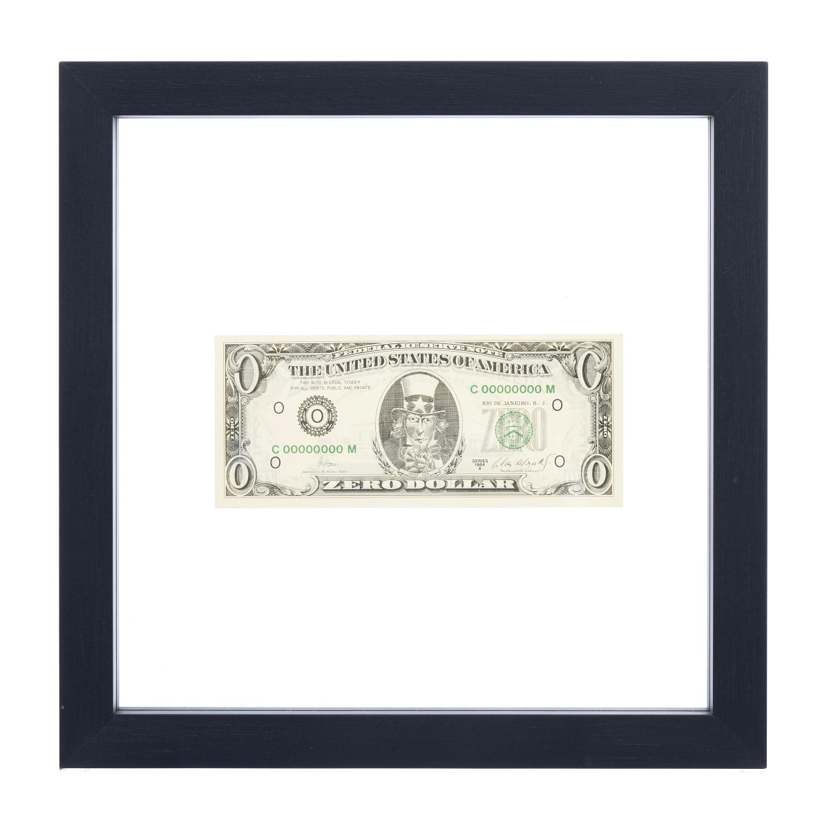 Impressão offset sobre papel, da série "Zero Dollars", 1978-84. Assinada e marcada 'series 1984 A'. Dim.: 6,5x15,5 cm.