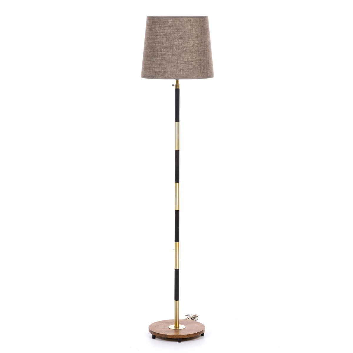 Dinamarca, c.1970, candeeiro de pé em pau-santo e metal dourado, abajour em tecido. Electrificado. Sinais de uso. Dim.: 147 cm.