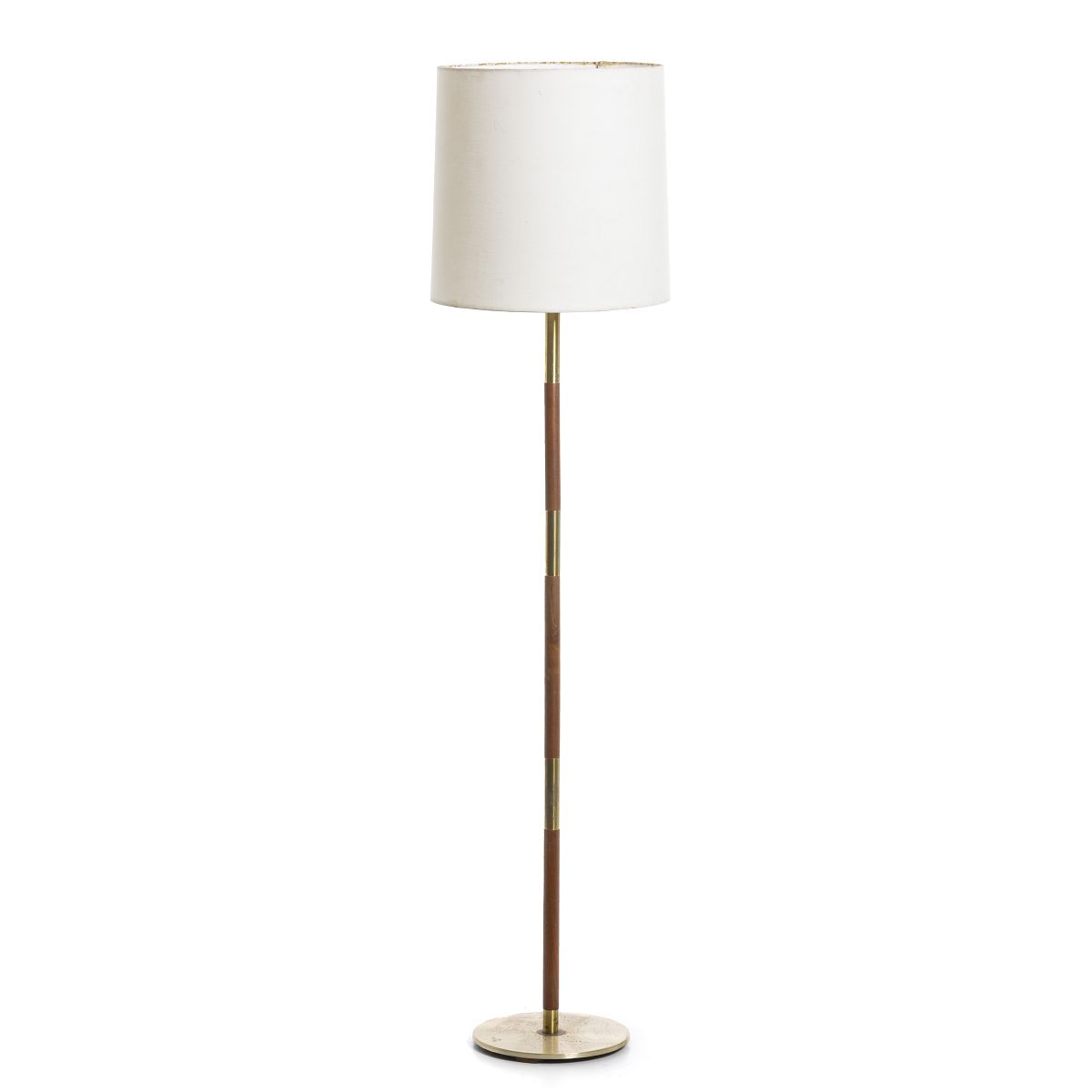 Dinamarca, c.1970, candeeiro de pé em teca e metal dourado, abajour em tecido. Electrificado. Sinais de uso. Dim.: cm.