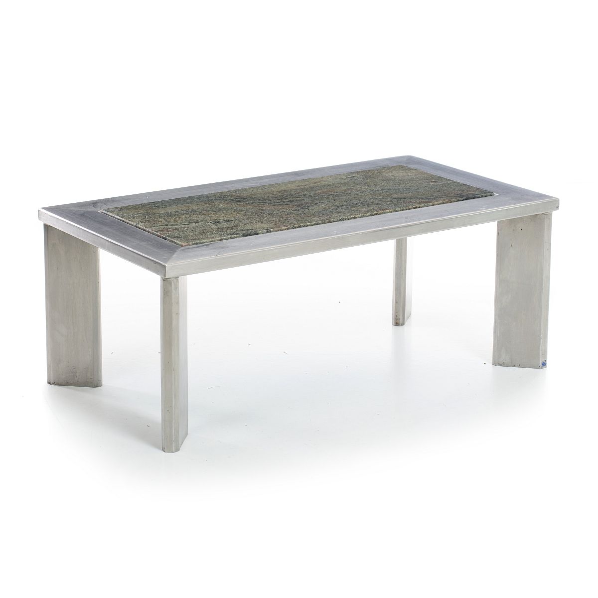 França, c.1970, estrutura em aço escovado, tampo em granito verde. Sinais de uso. Dim.: 40x96x66cm.