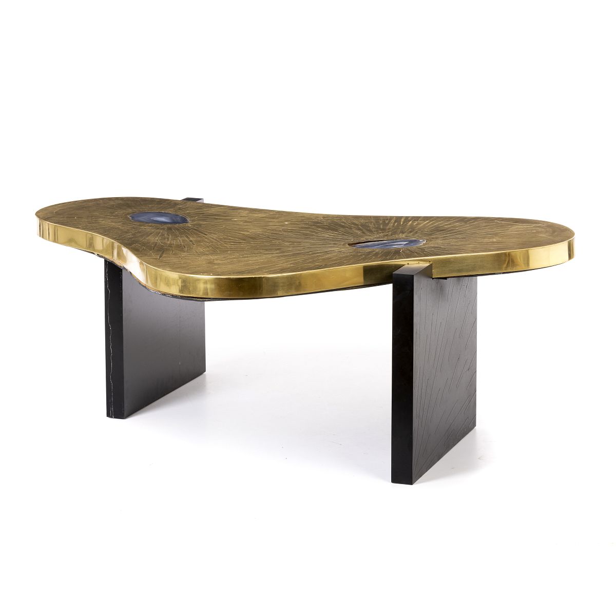 Bélgica, c.1970-80, pés em metal lacado a preto e entalhada, tampo em em latão gravado com aplicação de duas placas de geodo de ágata. Sinais de uso. Dim.: 51x142 cm.