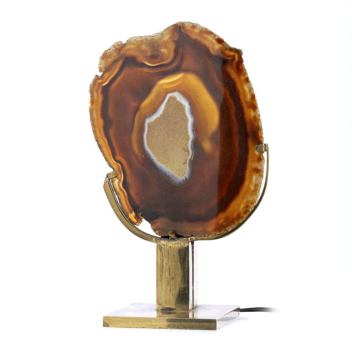 Bélgica, c.1970, estrutura em latão dourado com aplicação de placa de geodo de ágata. Assinado. Electrificado. Sinais de uso. Dim.: 27 cm.