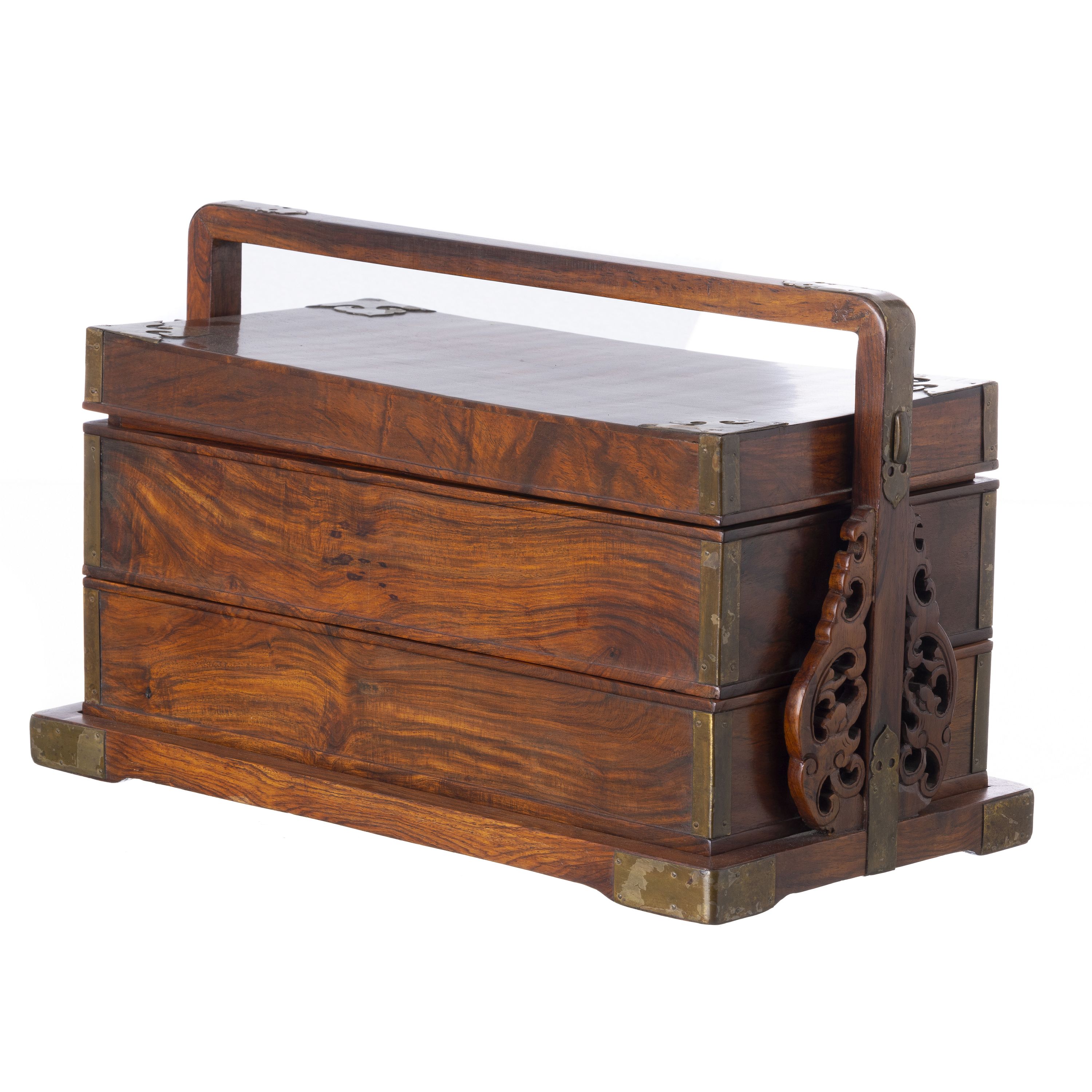 China, séc.XX, em madeira de huanghuali, ferragens em metal, caixa, cesto com 2 compartimentos, fecho em metal. Dim.: 21,5x35x19 cm.