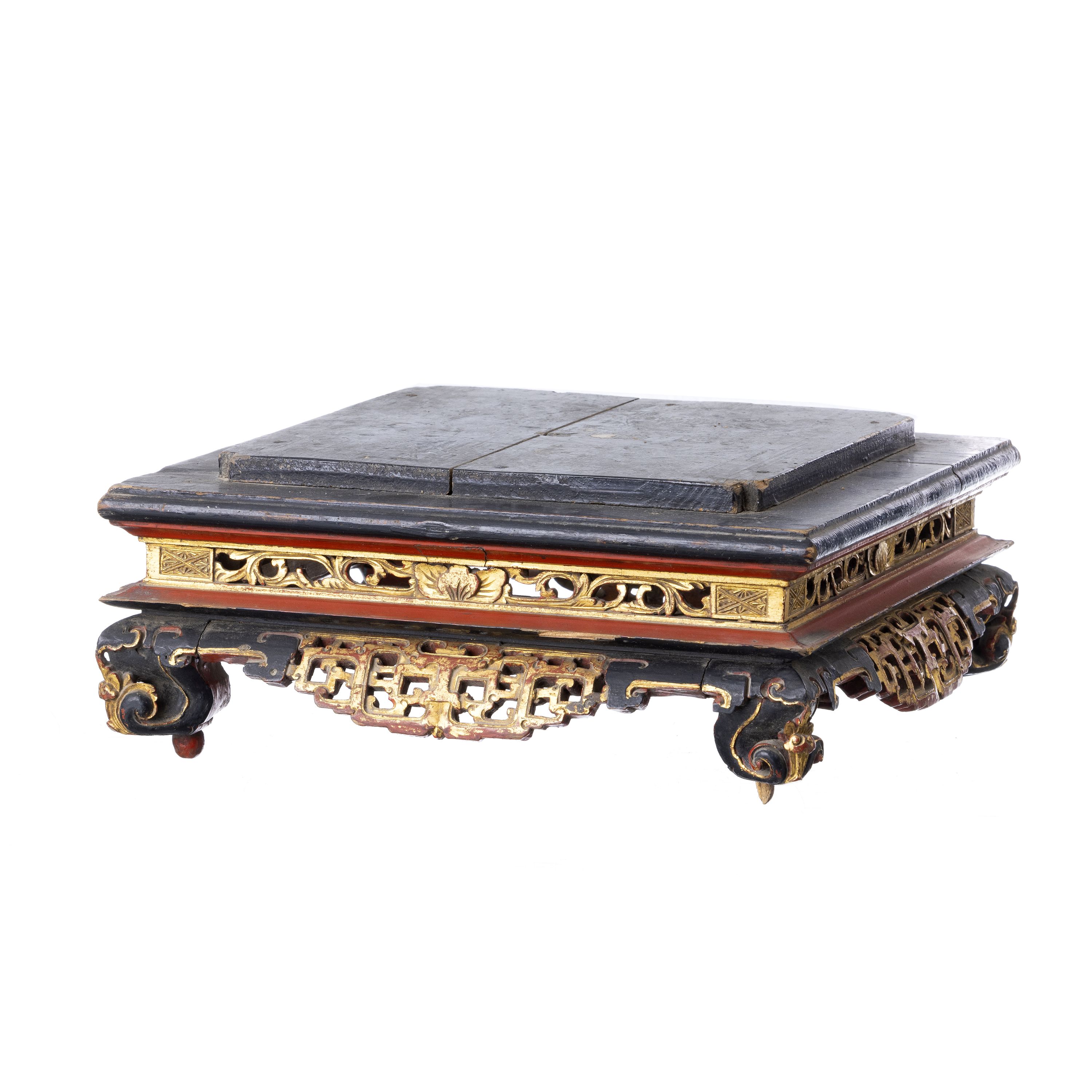 China, séc.XIX, base, peanha em madeira, decoração entalhada e vazada, policroma e a ouro. Pequenas faltas e defeitos. Dim.: 13x30x30 cm.