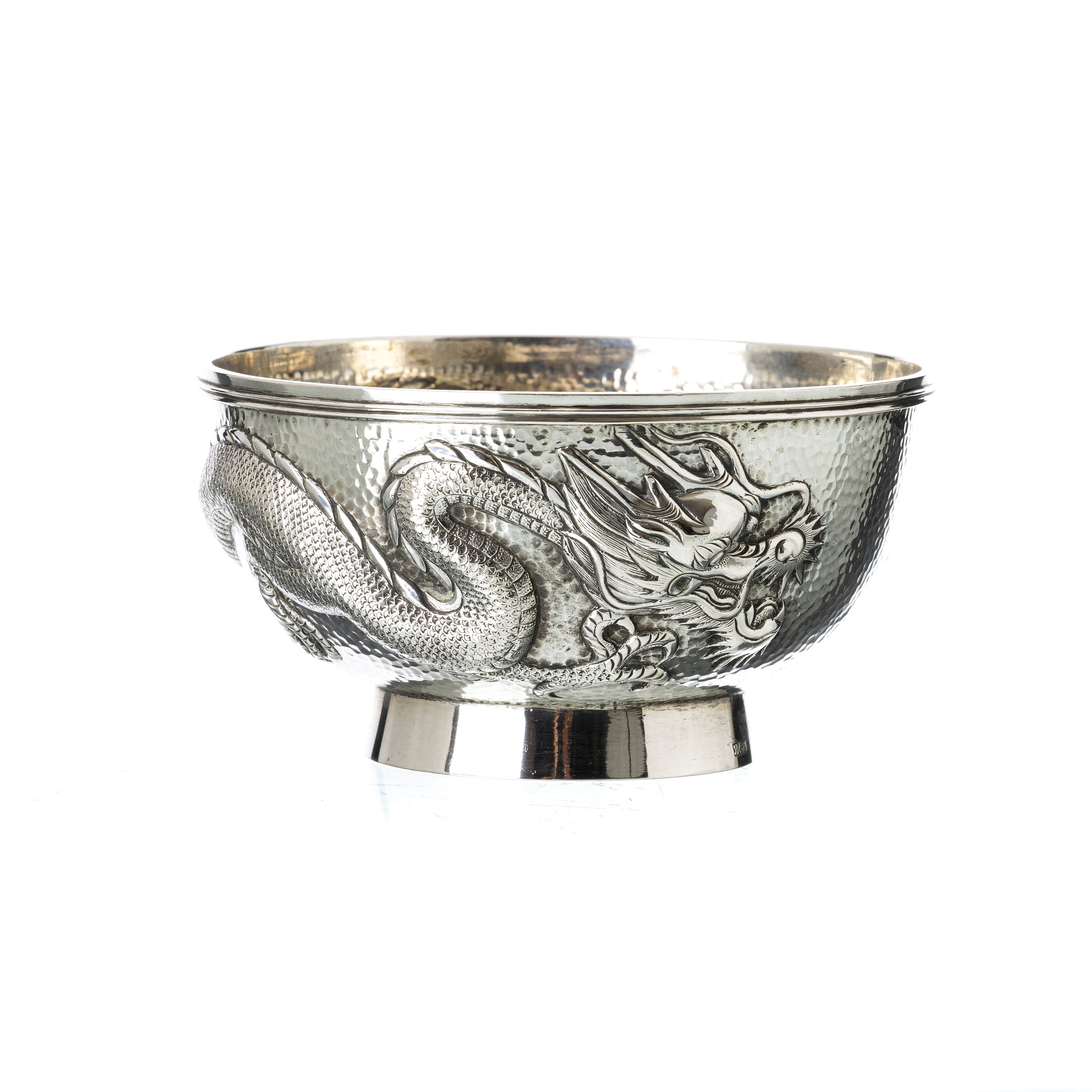 Prata chinesa, séc.XIX/XX, marca de ourives 'NSK', decoração relevada com dragão, fundo martelado. Sinais de uso. Peso aprox.:182g. Dim.:11,5cm.