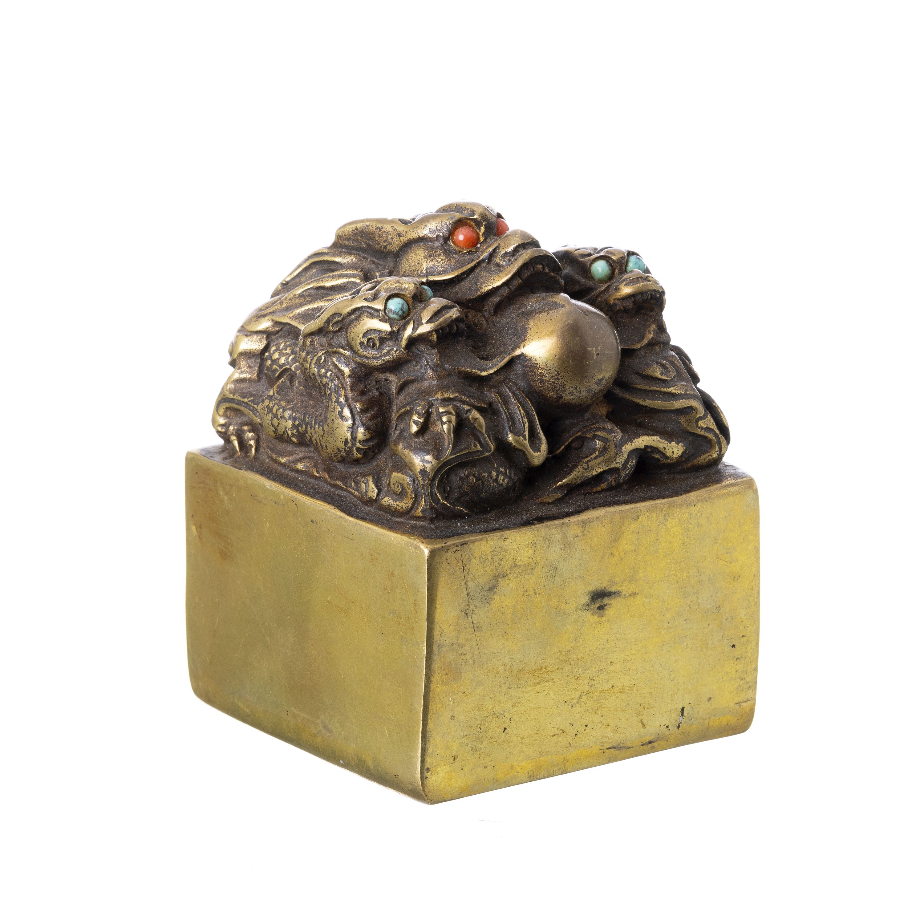 China, séc.XIX/XX, em bronze dourado relevado com dragões, olhos com pedraria. Sinais de uso. Dim.: 9,5 cm.