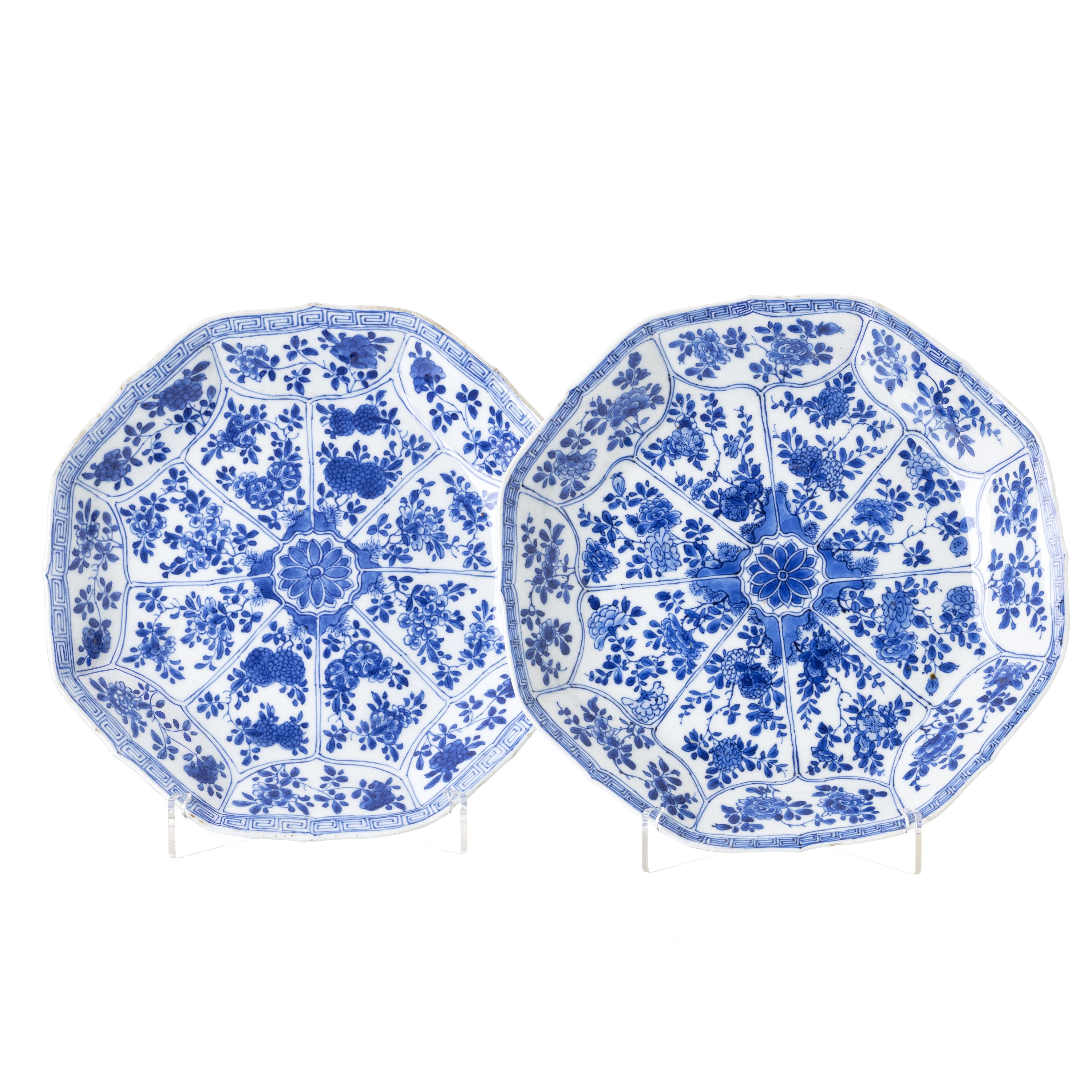 China, Kangxi, par de pratos oitavados, decoração a azul com motivos vegetalistas, verso decorado. Pequenos restauros. Dim.: 25 cm.