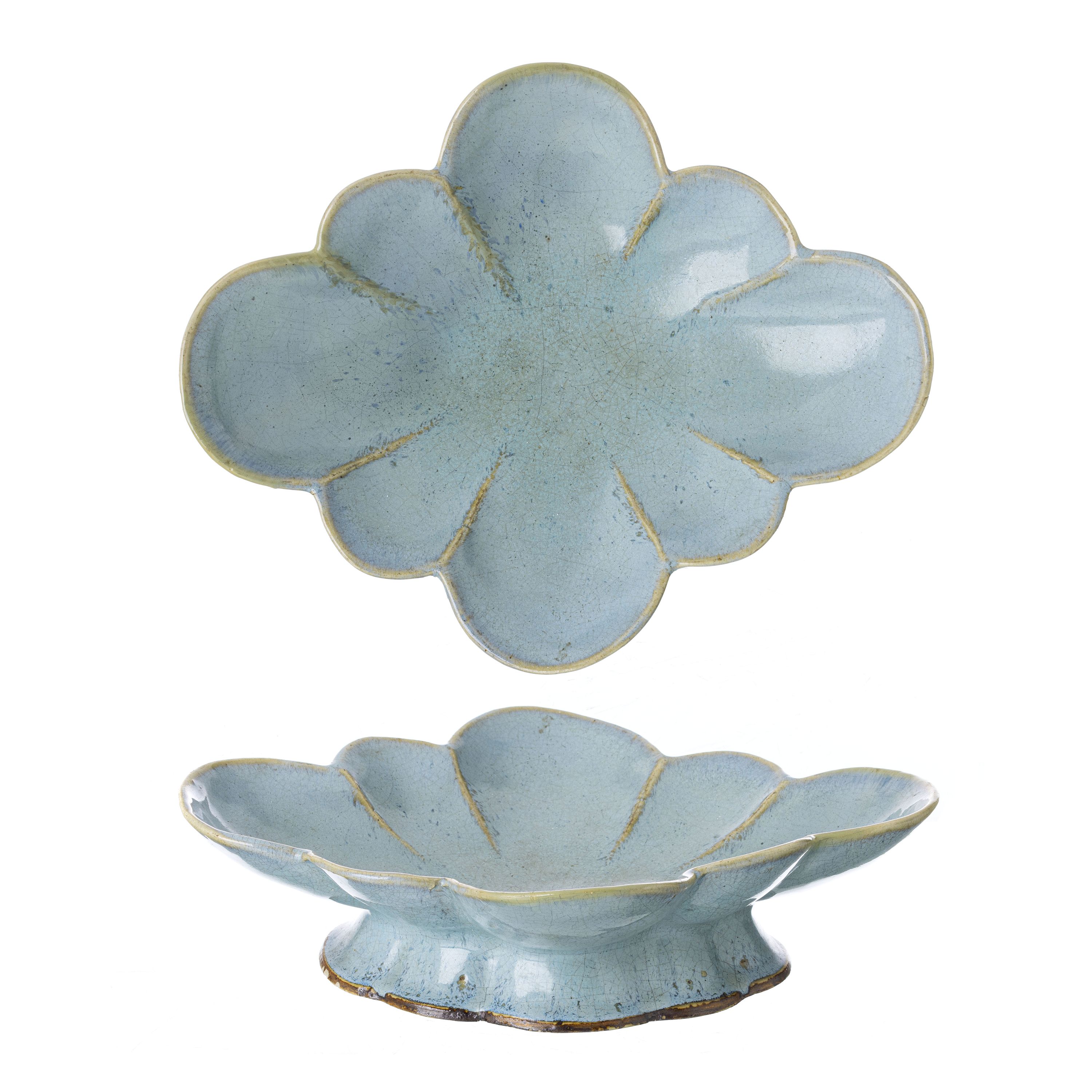 China, Dinastia Ming, grés porcelânico tipo Jun decoração vidrada monócroma a azul celeste, forma oval lobada de lótus. Sinais de uso. Dim.: 29,5 cm.