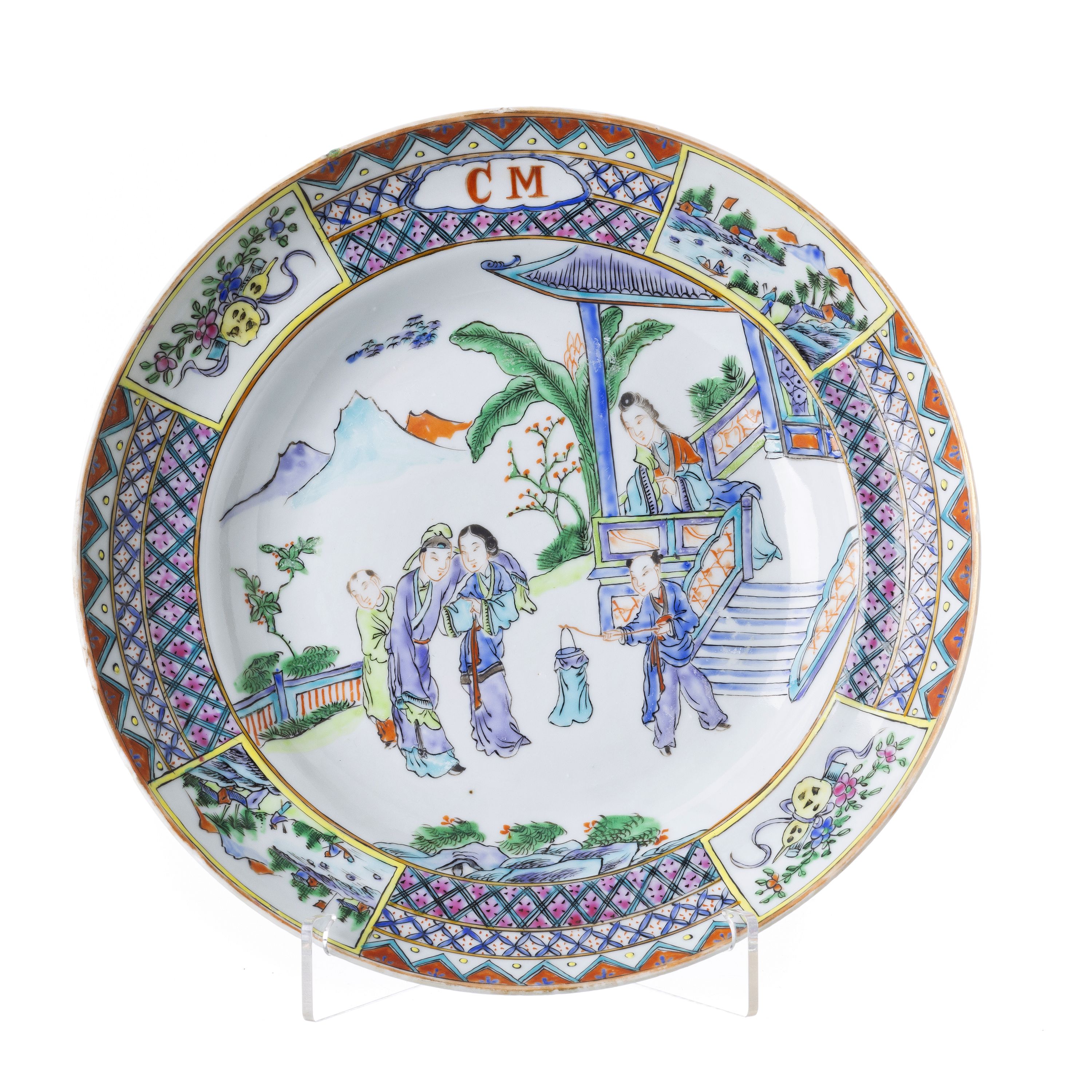 China, Minguo, decoração polícroma, rouge de fer e a ouro representando figuras, reserva com monograma 'CM'. Sinais de uso. Dim.: 25 cm.