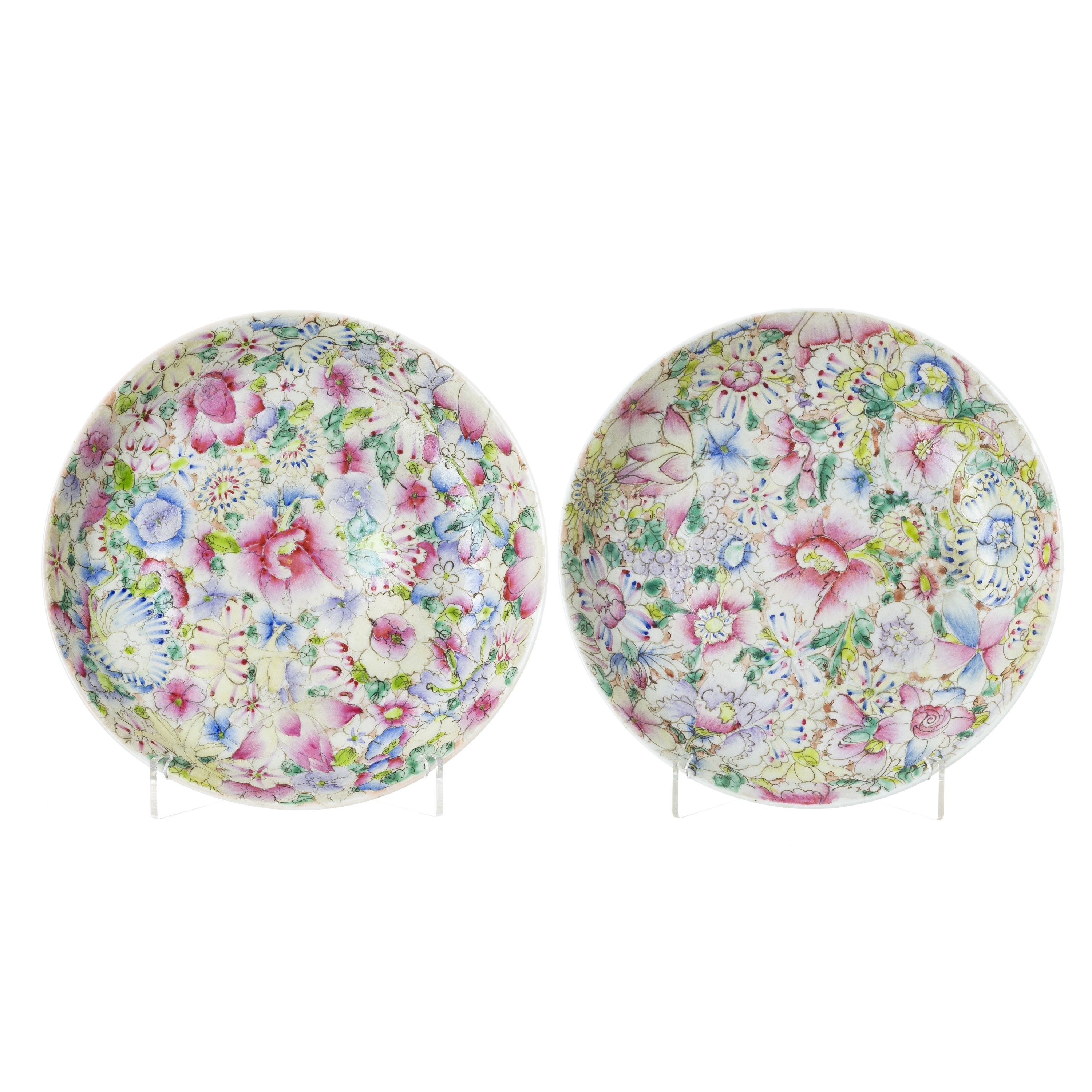 China, Minguo, porcelana moldada, decoração a esmaltes da familia rosa, 'mil flores', verso decorado, marca Qianlong apócrifa na base. Um com pequenos cabelos. Dim.: 23,5 cm.