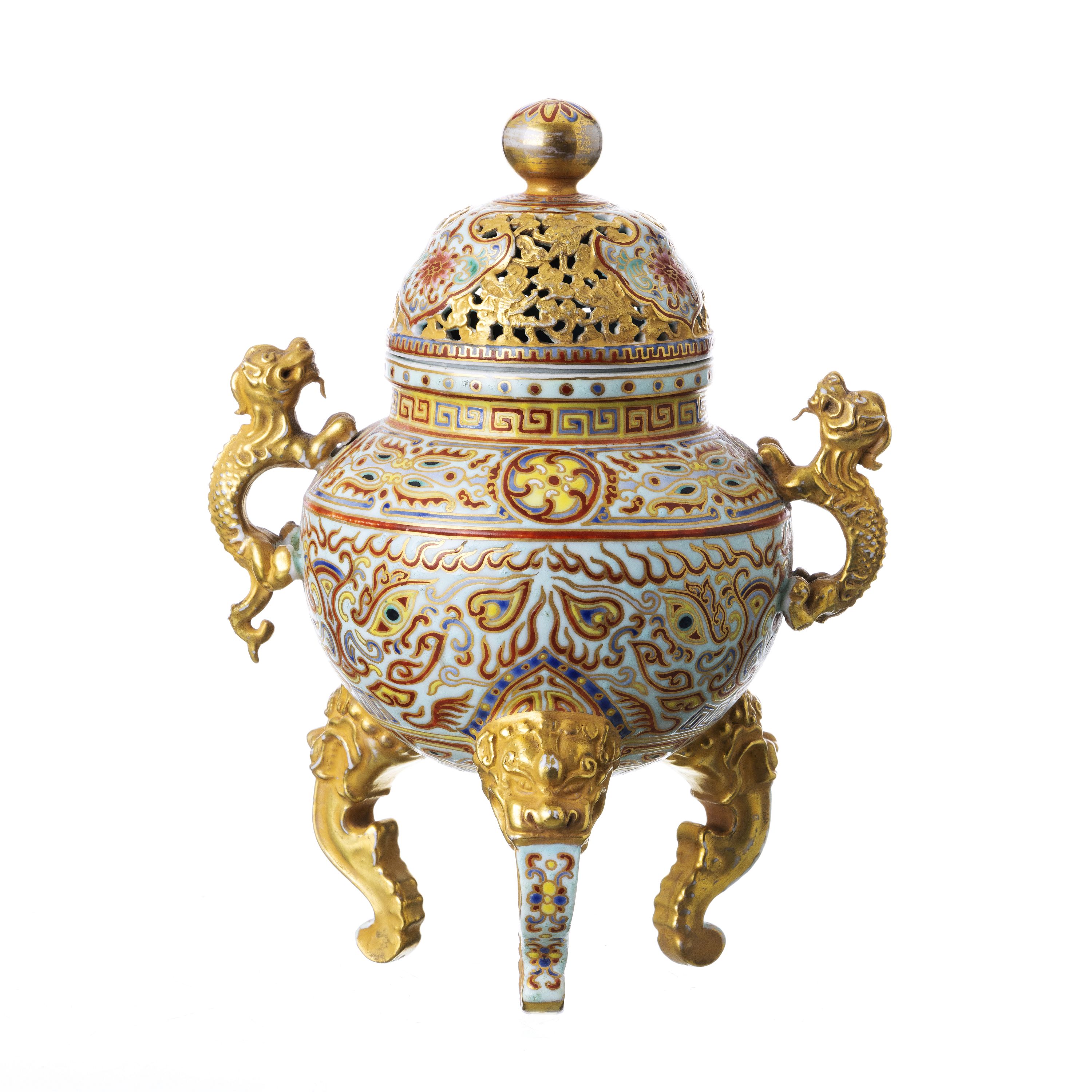 China, República, vazada e relevada, com decoração polícroma e a esmaltes e a ouro, com pés pegas e pés em relevo. Marca na base. Sinais de uso, falhas nas asas. Dim.:19cm.