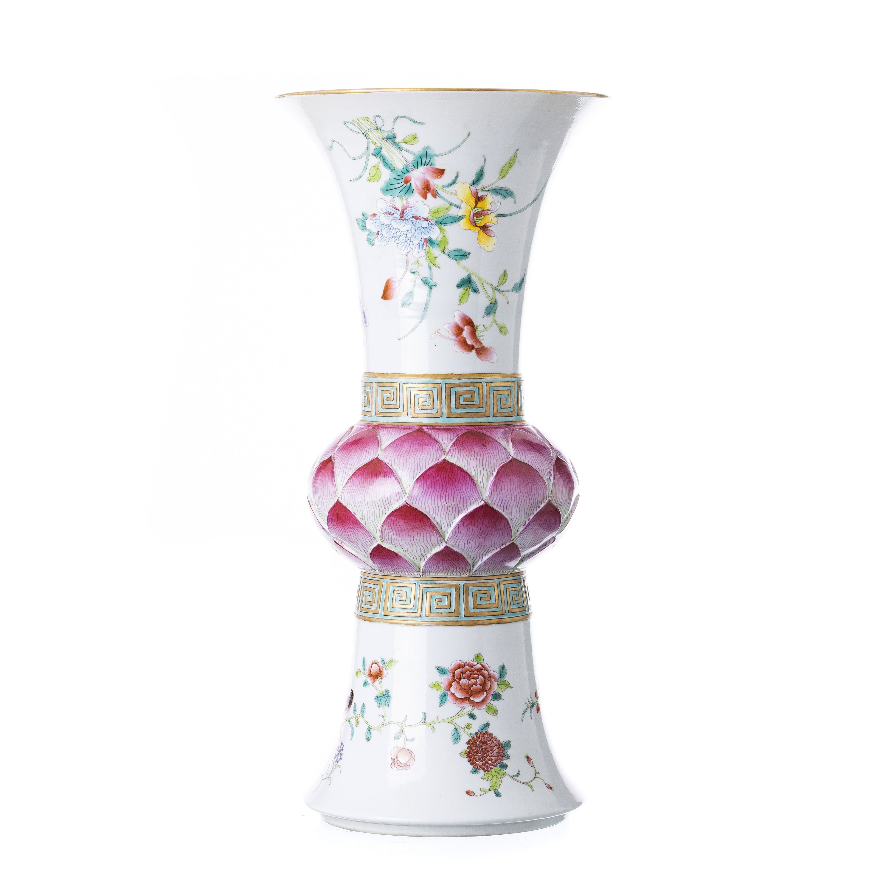 China, séc.XX, forma Gu, porcelana decorada a esmaltes polícromos, com representação de pétalas de lótus e flores. Dim.: 49 cm.