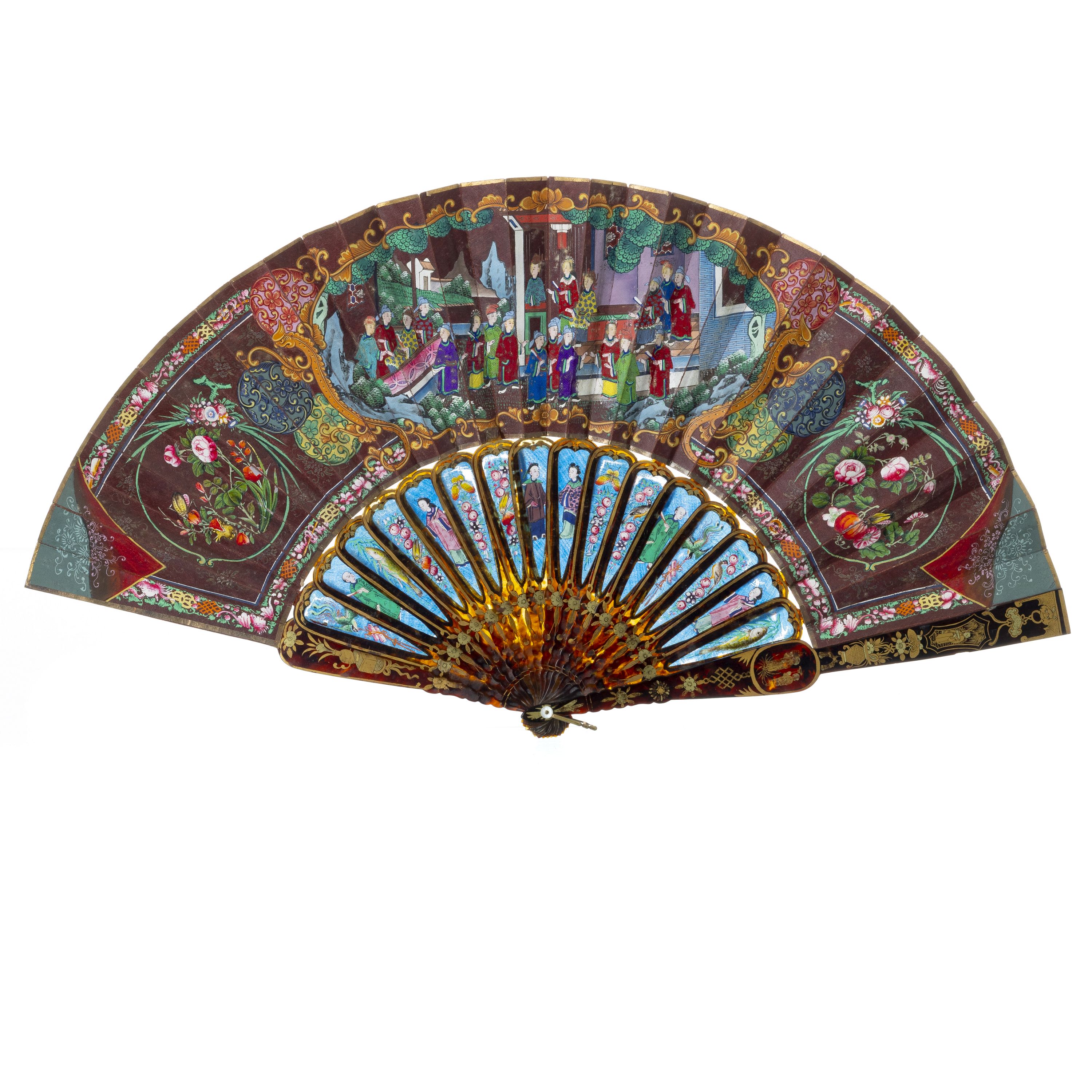 China, meados do séc.XIX, varetas em laca charão, decoração a ouro, papel pintado a guache com figuras em paisagem. Sinais de uso. Dim.: 49 cm.