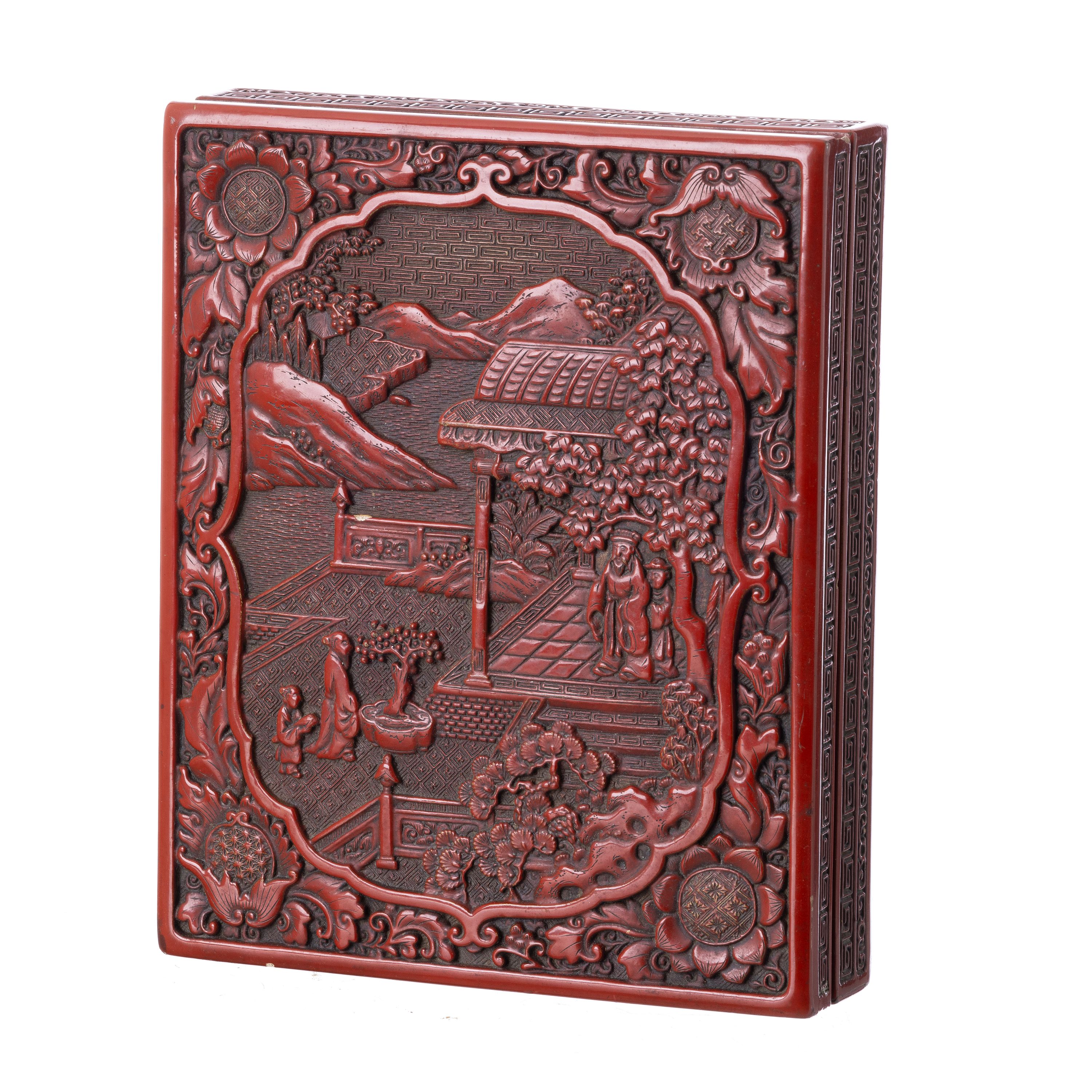 China, Minguo, caixa em laca chinesa cinnabar, decoração entalhada e a vermelho. Falta dos paineis laterais. Dim.: 5x25x20 cm.