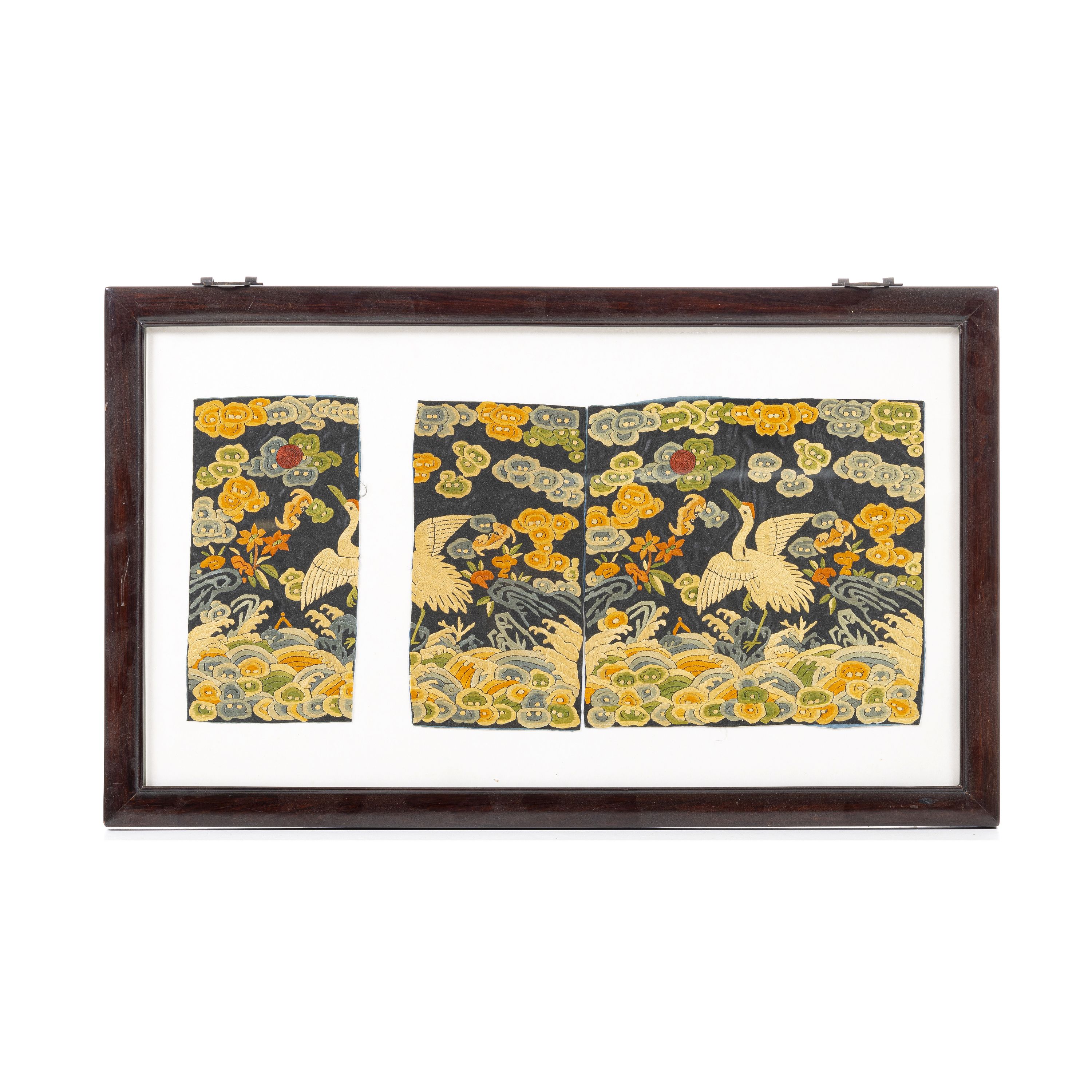 China, séc.XIX, seda bordada, frente e verso de emblema de rank representando cegonha entre aves entre motivos vegetalistas. Emoldurado. Dim.: 45,5x75 cm (moldura).