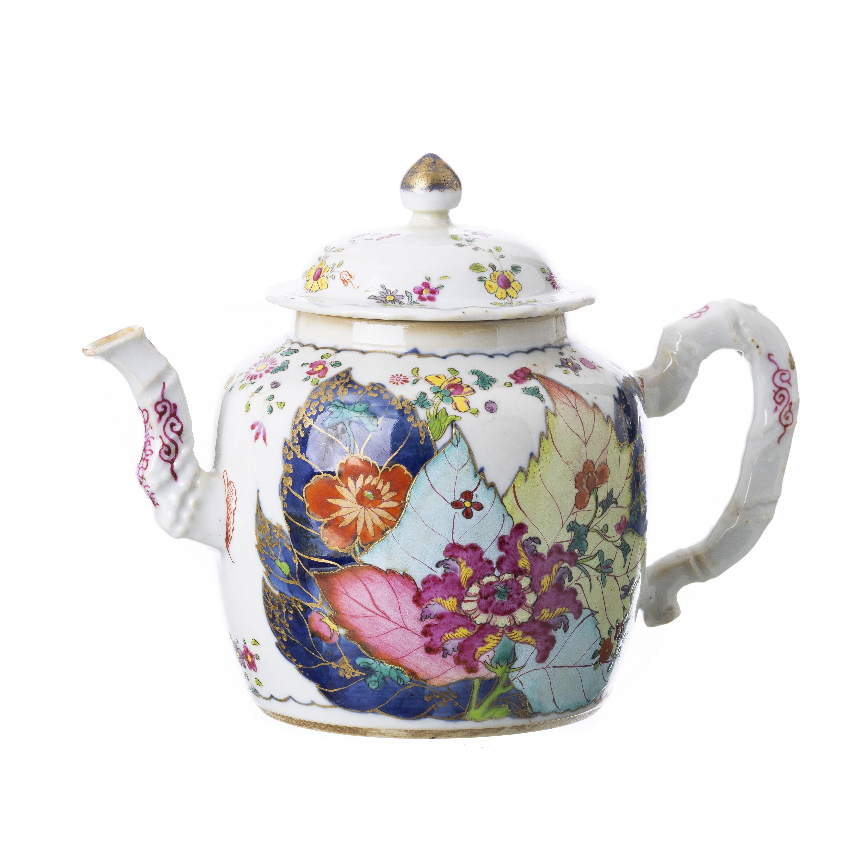 China, período Qianlong, decoração policromada a esmaltes da família rosa e a ouro, dita 'folha de tabaco'. Falha no bico, pequeno restauro no pomo da tampa. Dim.: 21 cm.