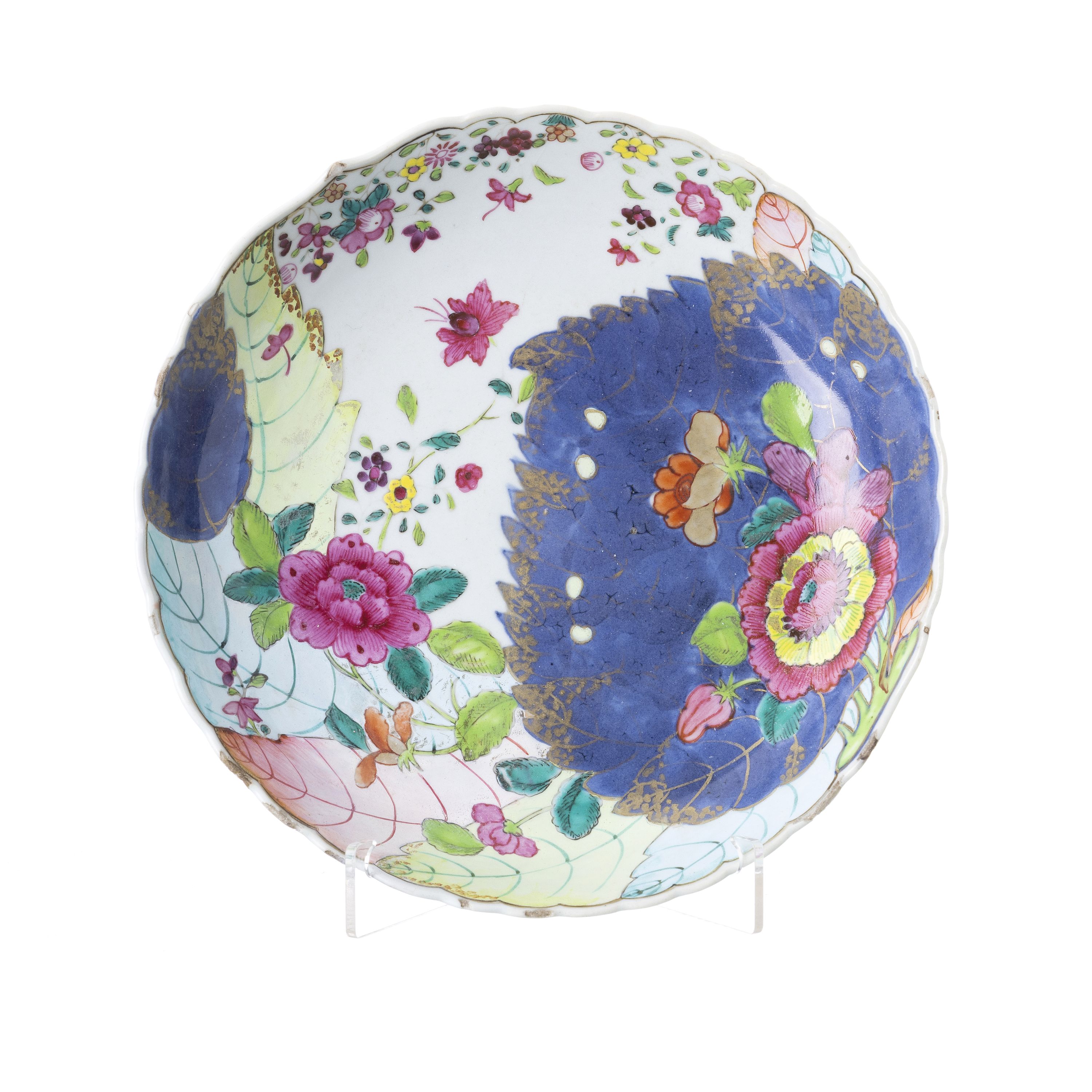 China, período Qianlong, de bordo gomado, decoração policromada a esmaltes da família rosa e a ouro, dita 'folha de tabaco'. Pequenos defeitos, restauro. Dim.: 25 cm.