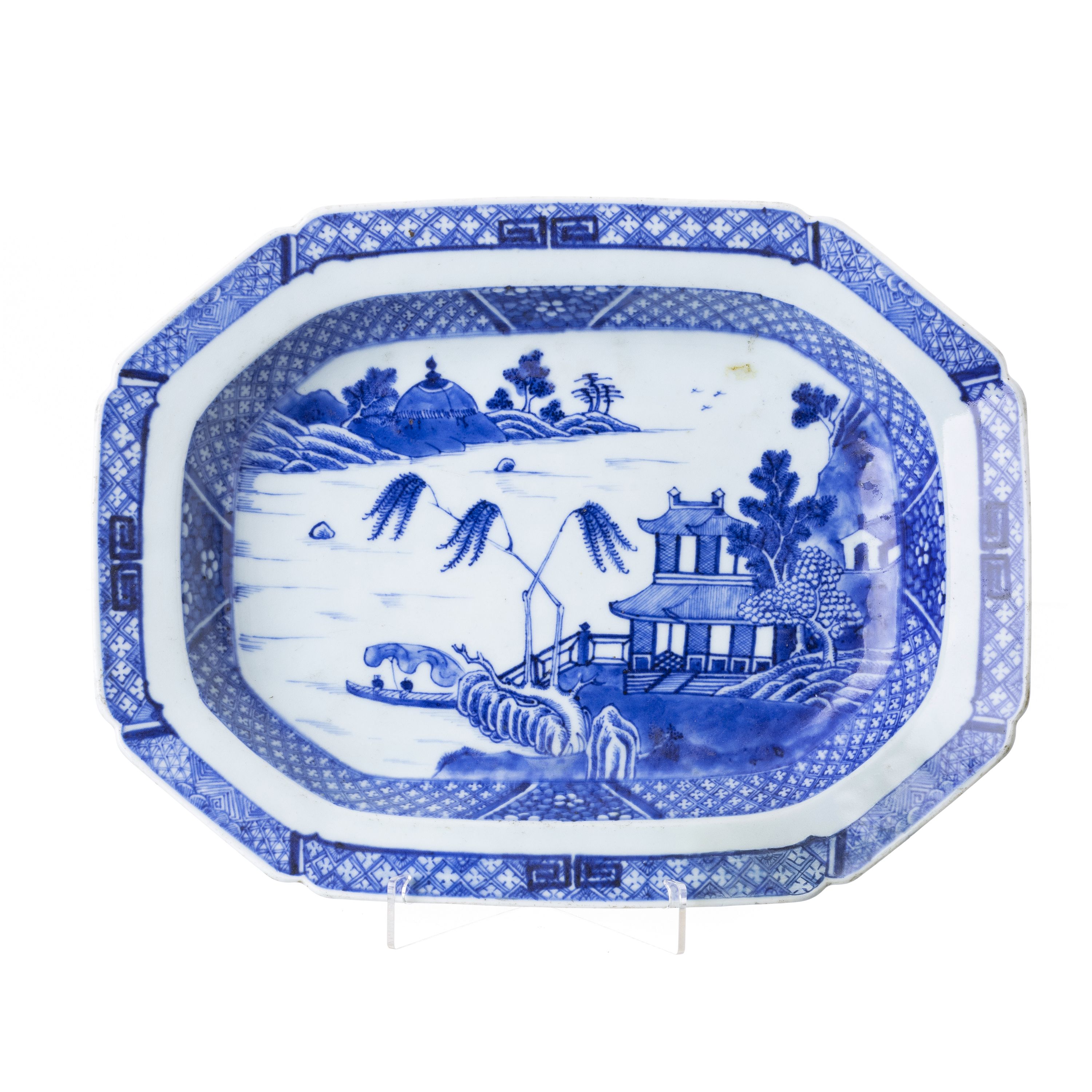 China, período Qianlong, decoração a azul e branco representando paisagem fluvial com pagodes. Dim.: 37,5 cm.