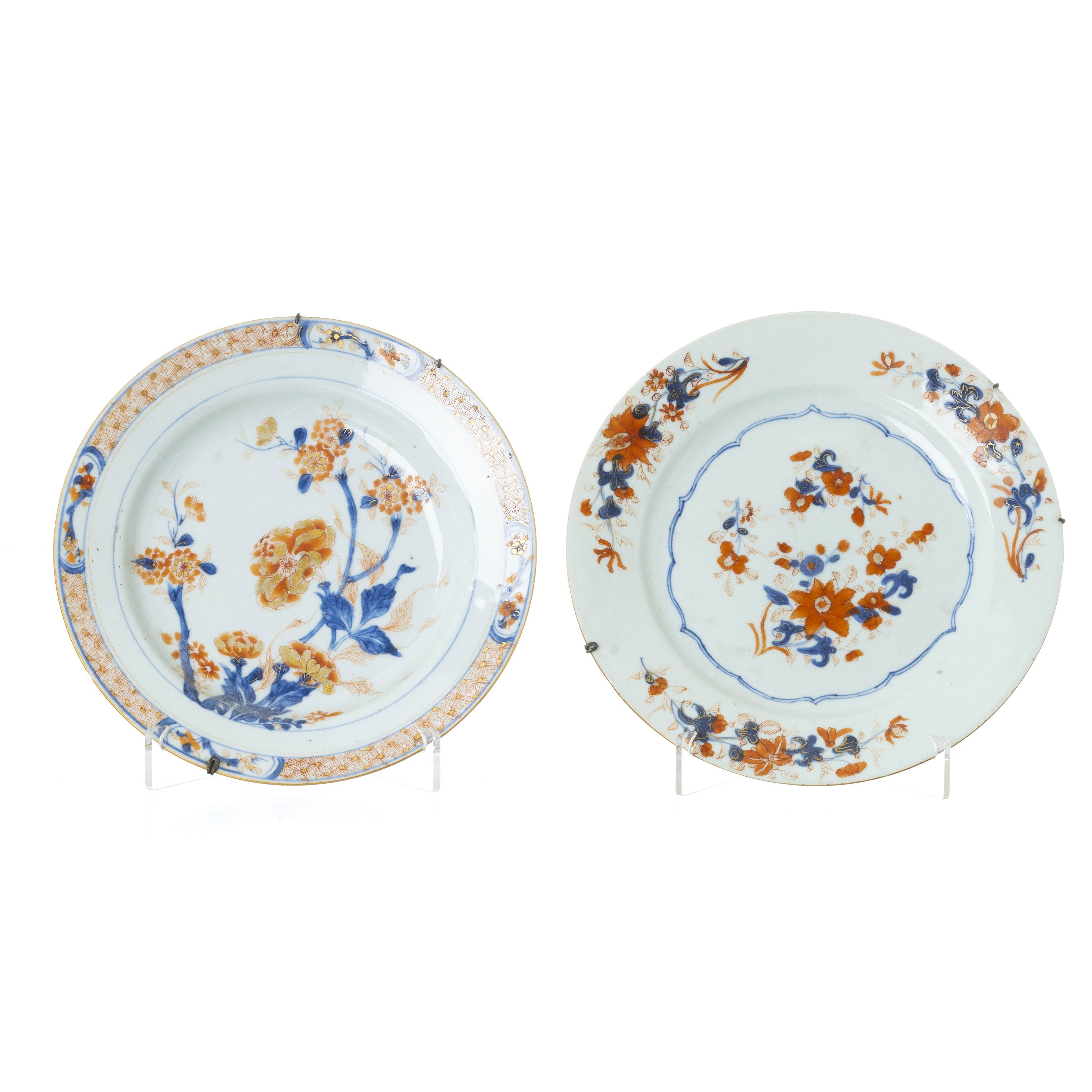 China, período Kangxi, decoração floral a azul, rouge-de-fer e ouro, dita imari. Pequenos cabelos. Dim.: 22,5 e 23 cm.