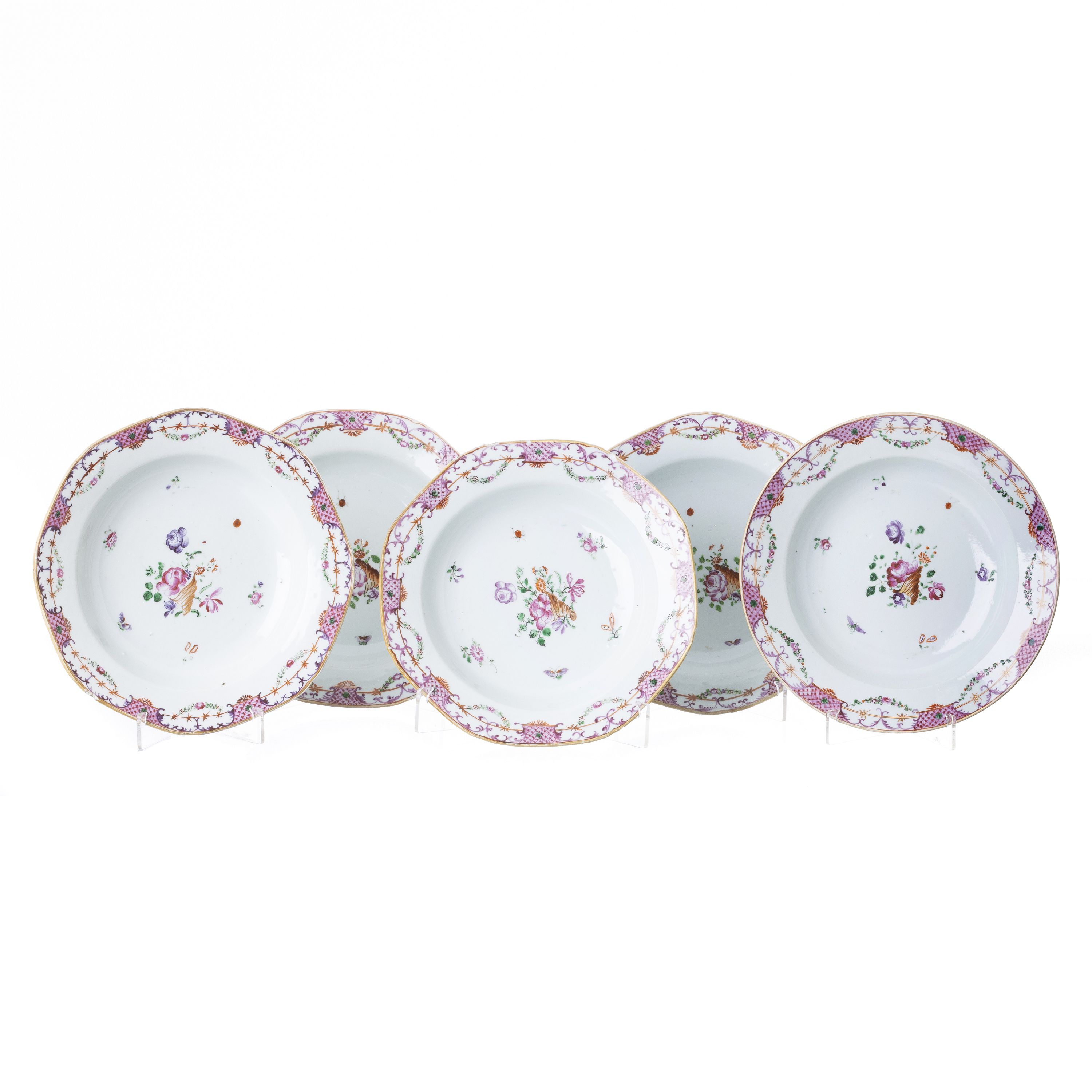 China, Qianlong, decoração policroma e a ouro em esmaltes da familia rosa com flores, quatro oitavados um redondo. Sinais de uso, pequenas falhas. Dim.:11cm. 22,5 cm