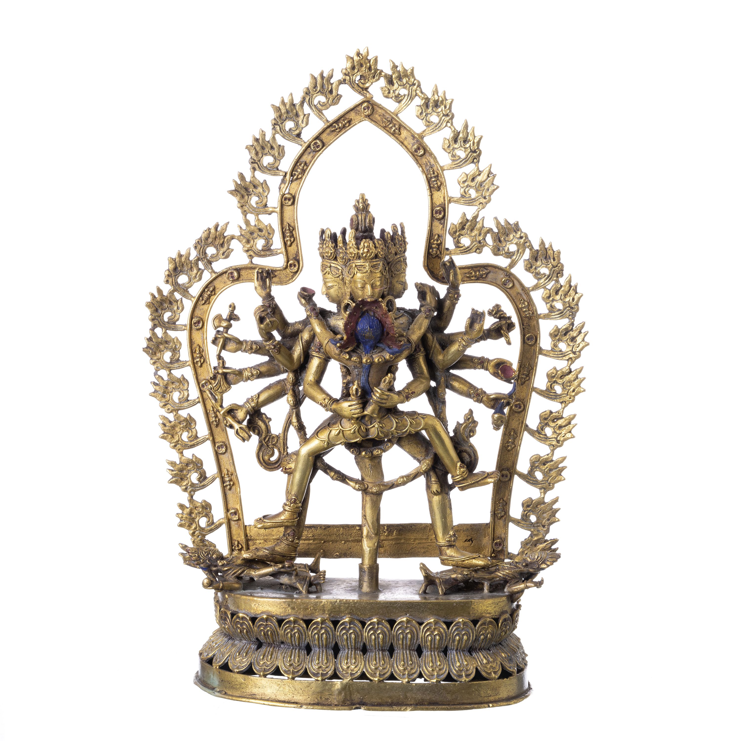 Tibete, séc.XX, em bronze dourado com policromia, representando Chakrasamvara em união com consorte Vajravarah, com atributos, cobre trono de lotus. Sinais de uso. Dim.:41cm.