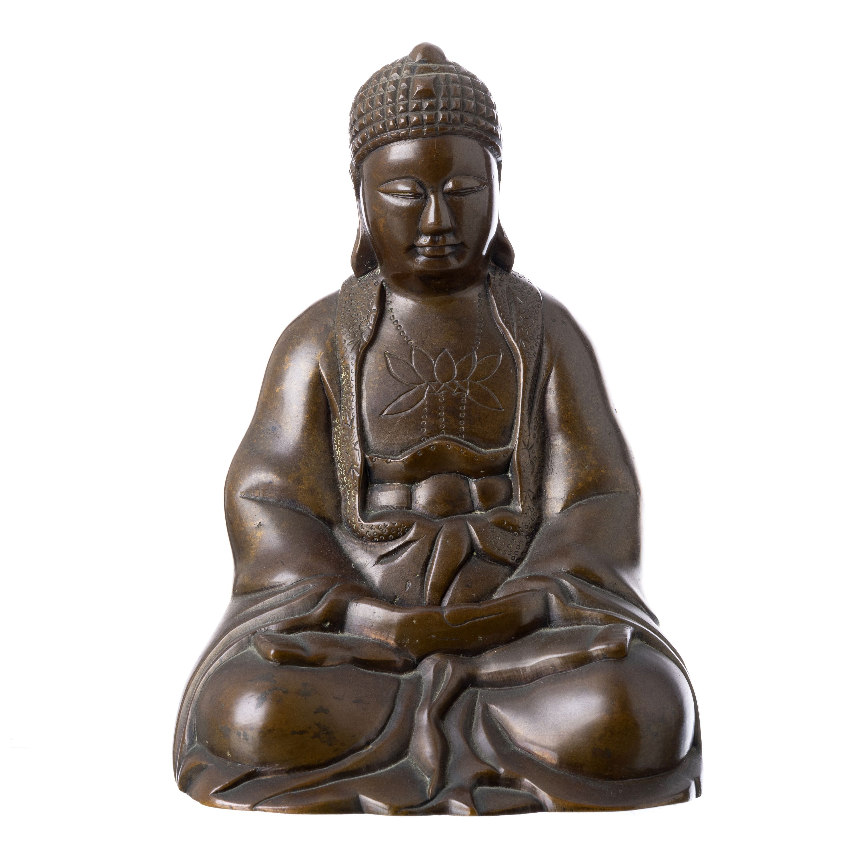 China, séc.XIX/XX, bronze patinado, representando Buda sentado com mãos em mudra. Sinais de uso. Dim.:24,5cm.