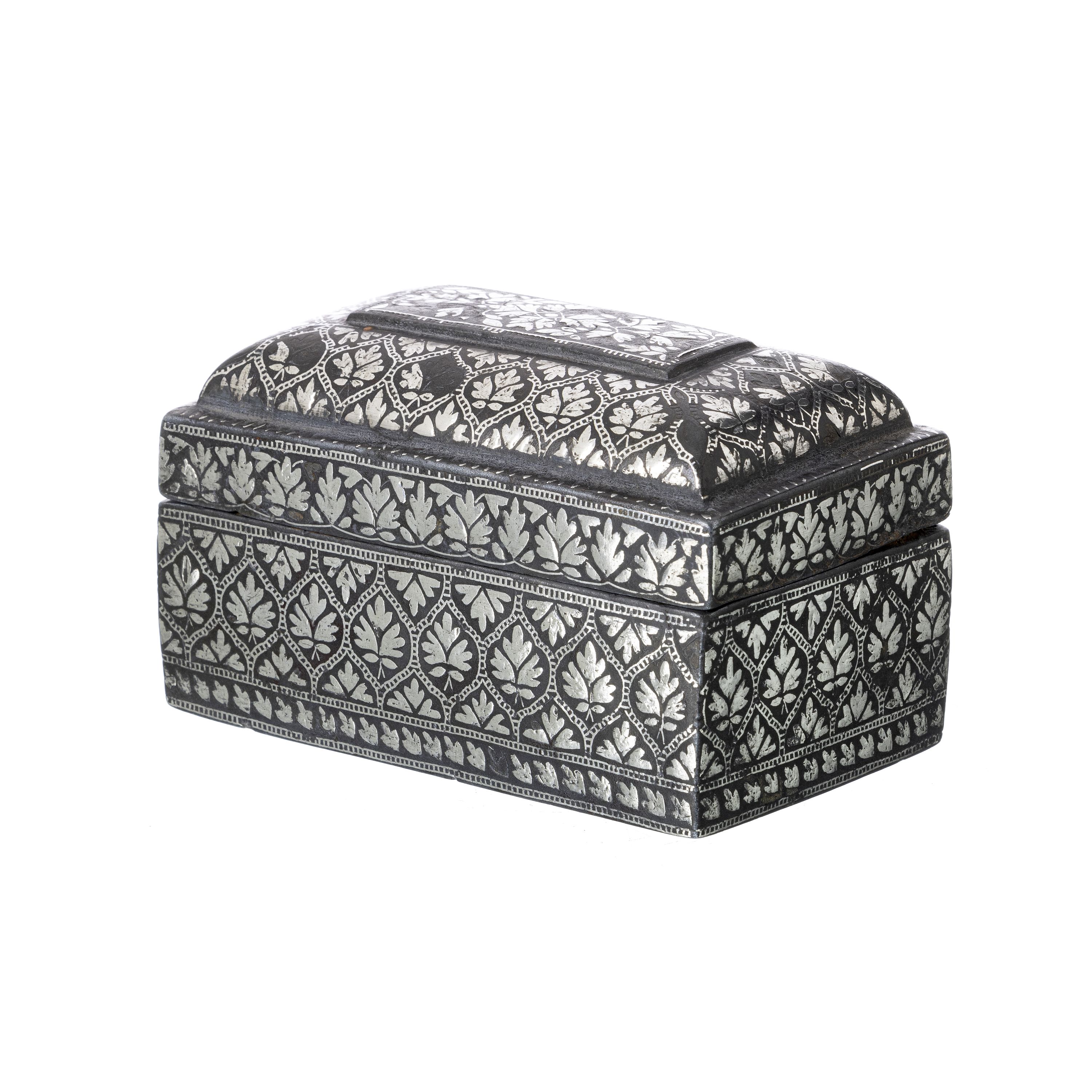 Índia, Mogol séc.XVIII, em liga metálica, com embutidos em prata, Bidri, decoração vegetalista. Sinais de uso. Dim.:7,5x12,5x7,5cm.