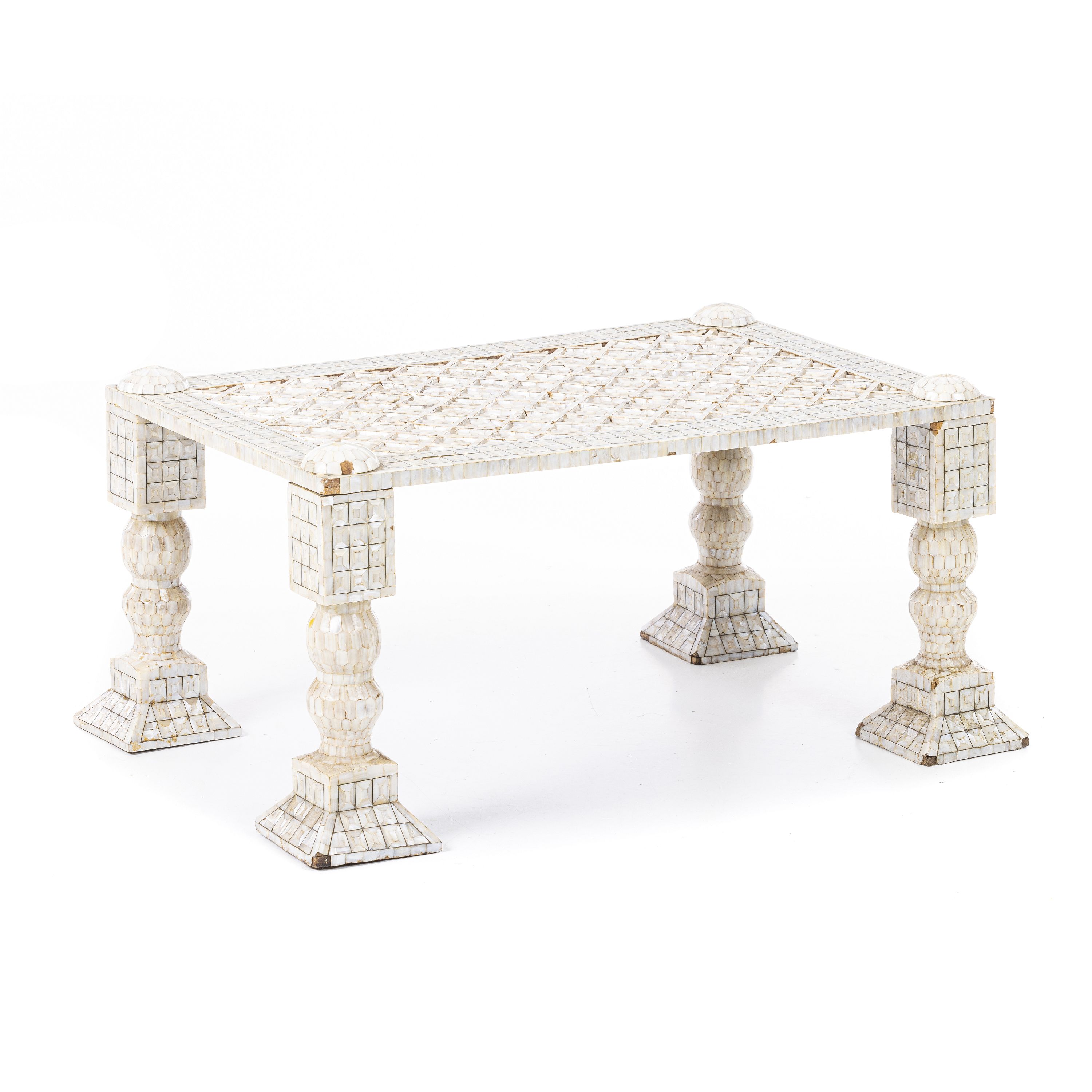 Índia, Gujarate, séc.XIX, mesa de apoio em madeira revestida a placas de madrepérola entalhada. Sinais de uso, pequenas faltas e defeitos. Dim.:43x98x66cm.