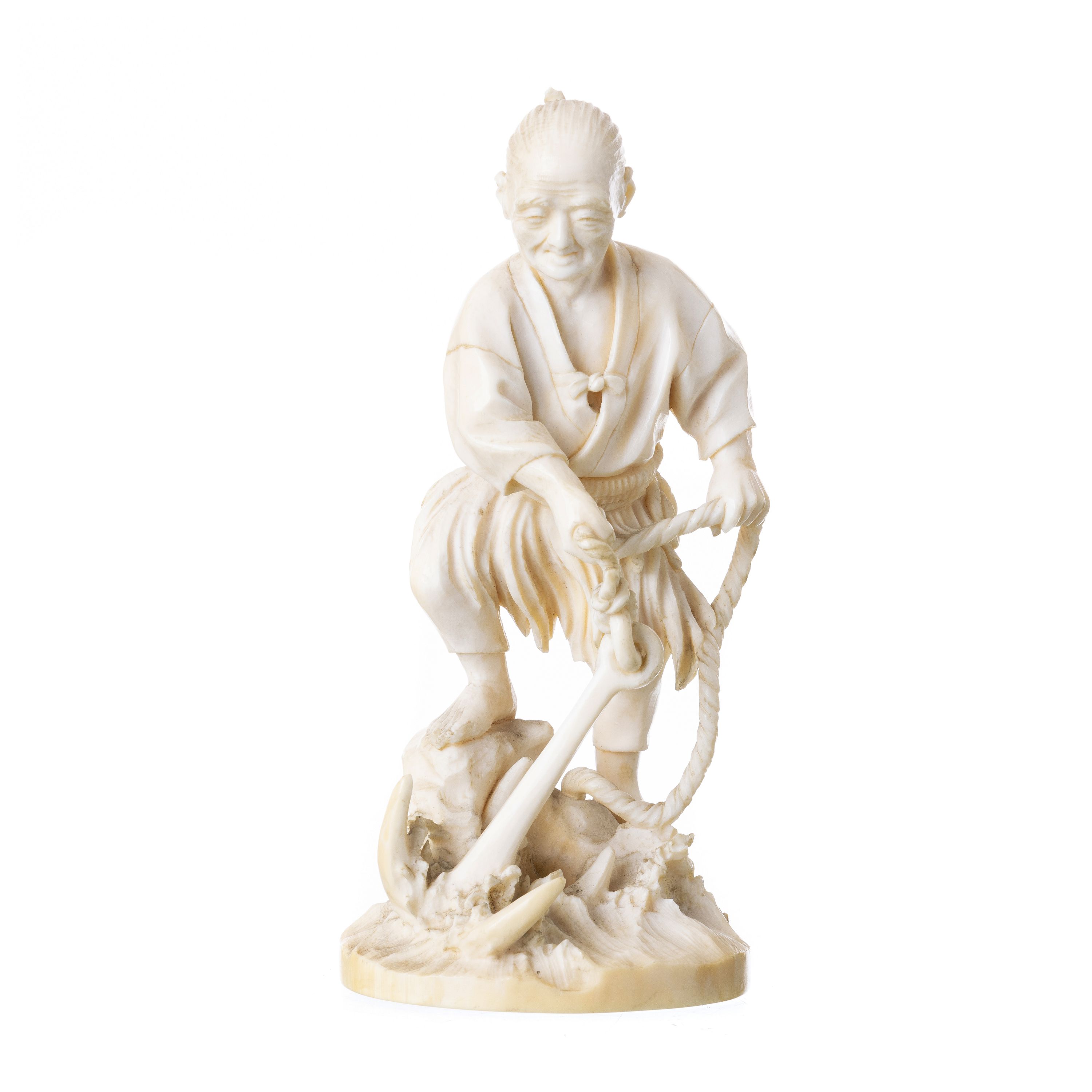 Japão, Meiji, marfim esculpido representando figura de pescador. Sinais de uso. Peso aprox.: 219grs. Dim.: 15cm.