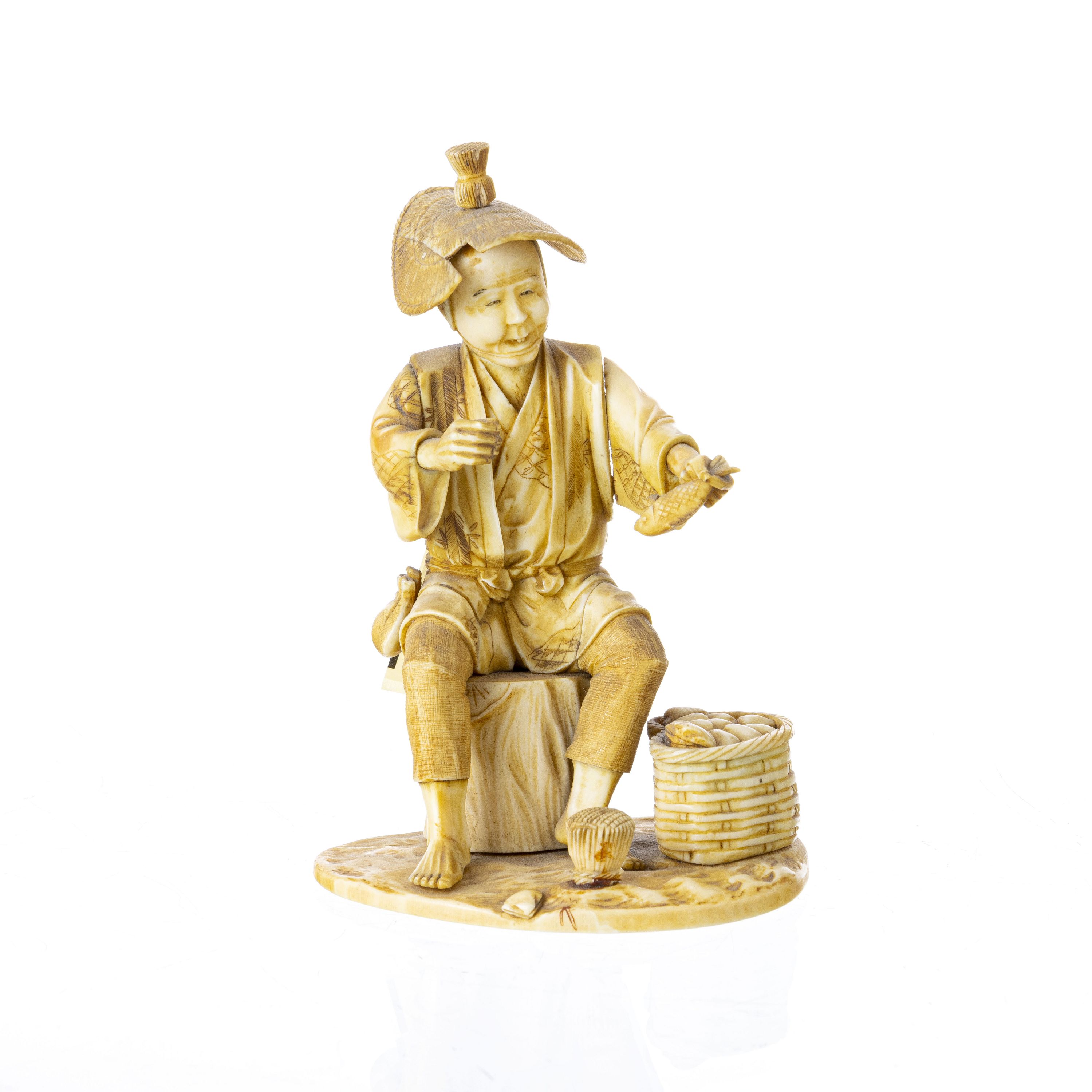 Japão, Meiji, marfim esculpido representando figura de vendedor, assinado na base. Sinais de uso, defeito no chapéu. Peso aprox.: 218grs. Dim.: 13,5 cm.