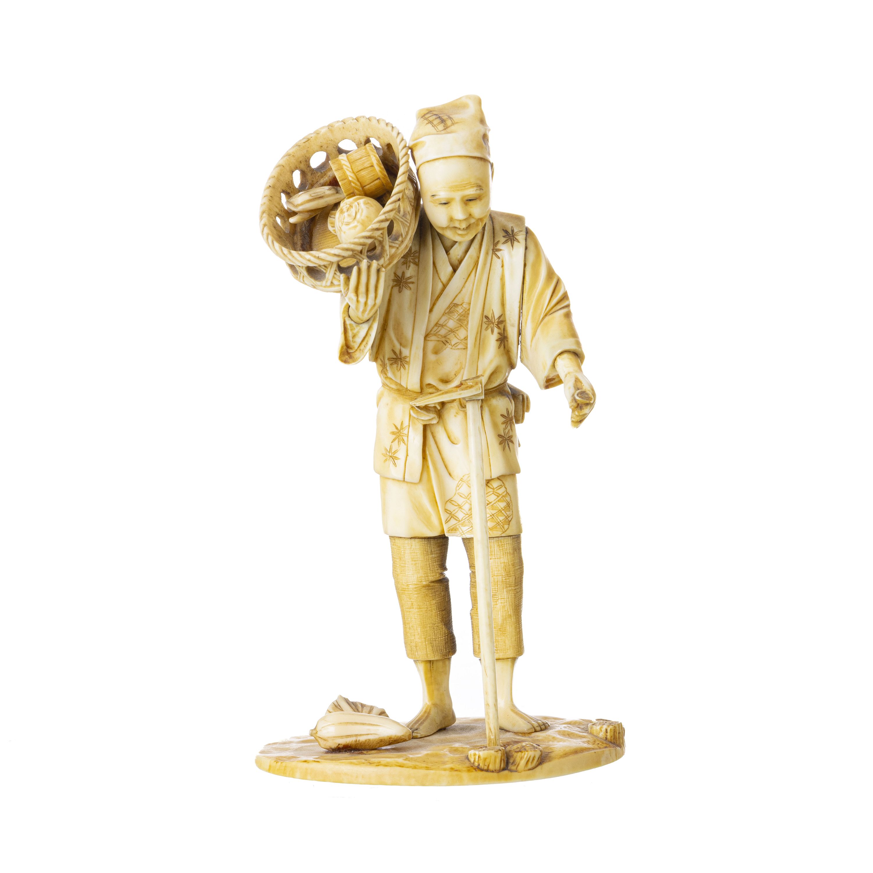 Japão, Meiji, marfim esculpido representando figura de agricultor, assinado na base. Sinais de uso, faltas e defeitos. Peso aprox.: 171,46grs. Dim.:15,5 cm.
