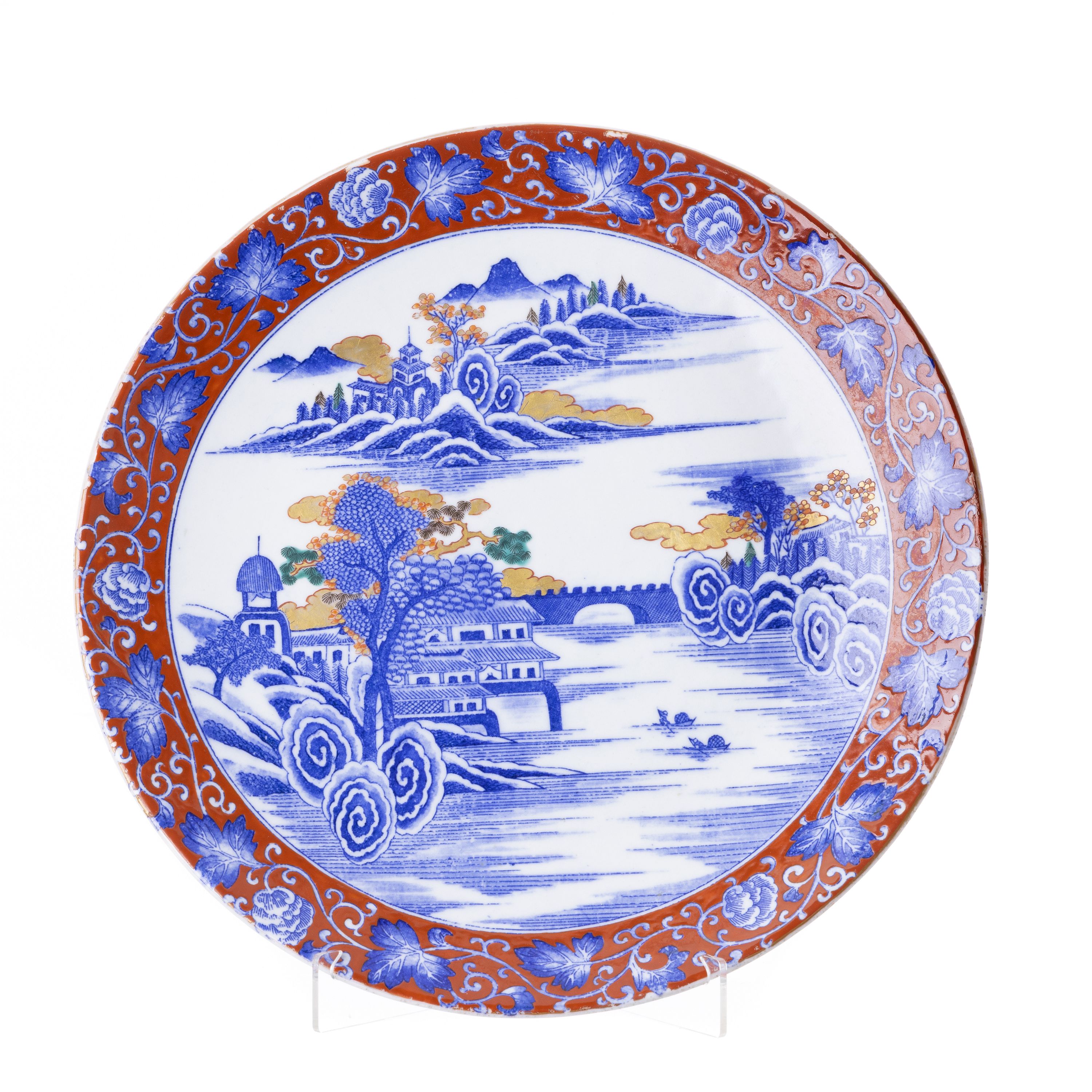 Japão, Meiji, decoração policroma, rouge de fer e ouro com paisagem fluvial, tarja vegetalista, verso decorado. Dim.: 37 cm.