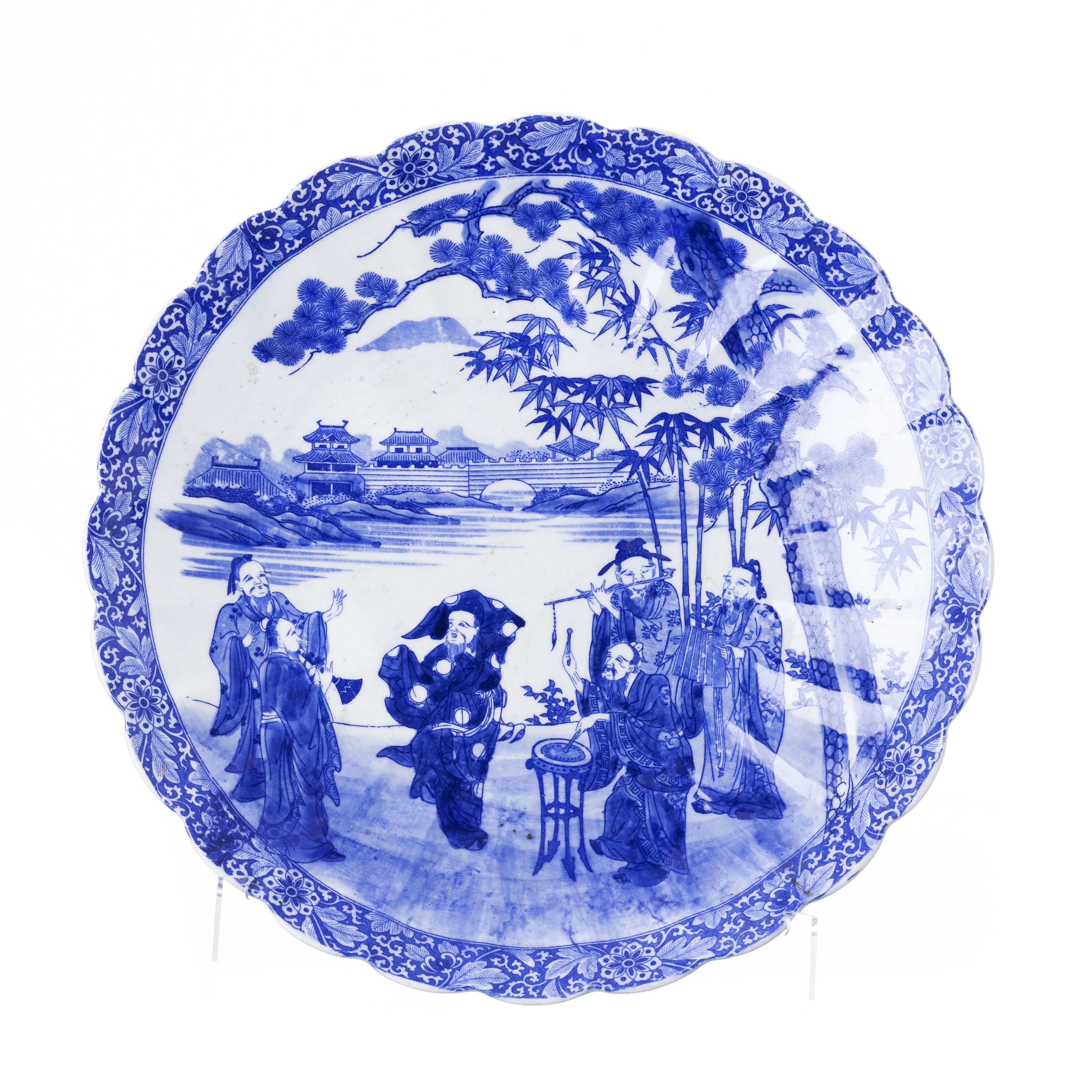 Japão, Meiji, porcelana moldada de borod recortado, decoração a azul com figuras em paisagem, verso decorado. Dim.: 46 cm.