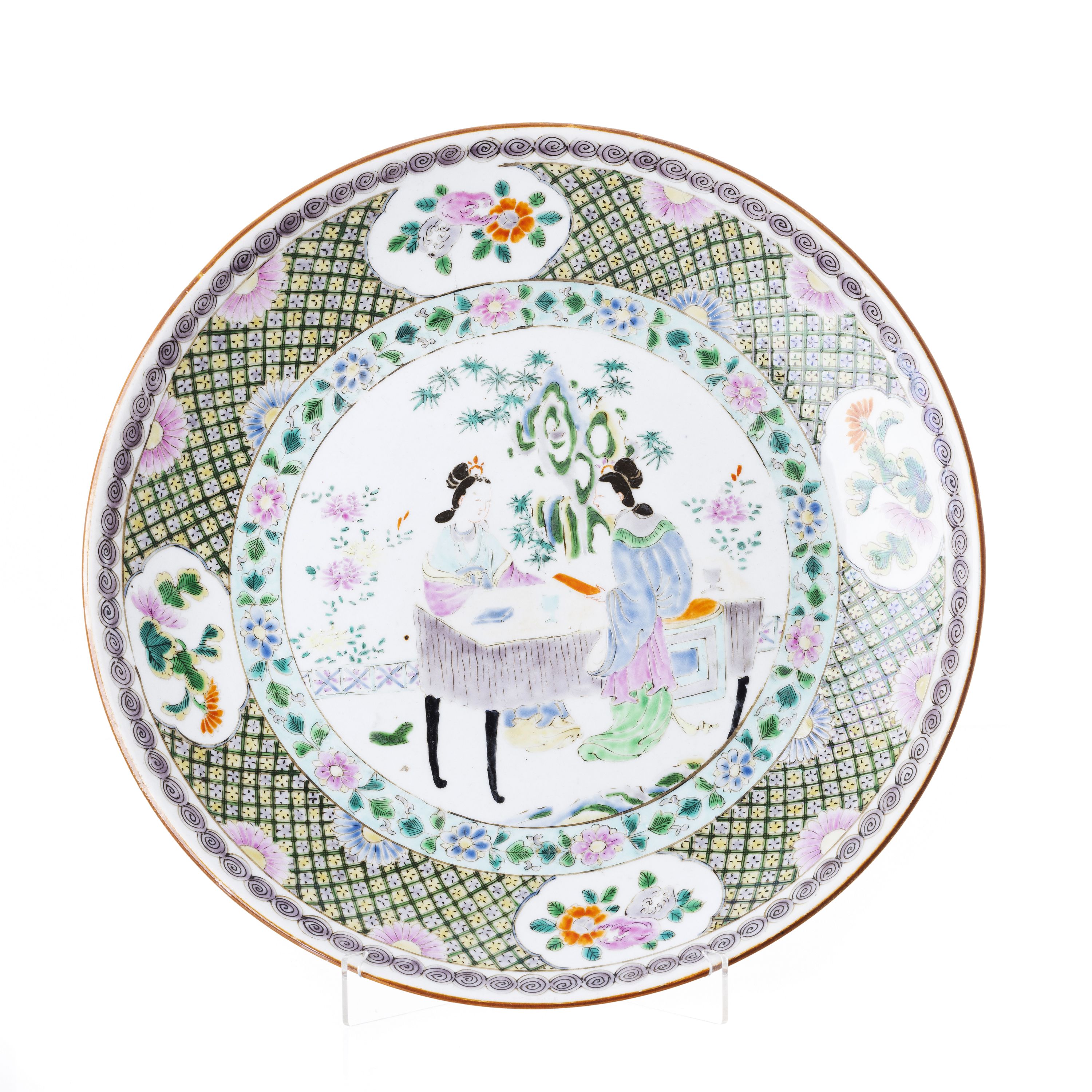 Japão, Meiji, decoração polícroma com flores, reserva central com figuras, marcado no verso. Dim.: 40 cm