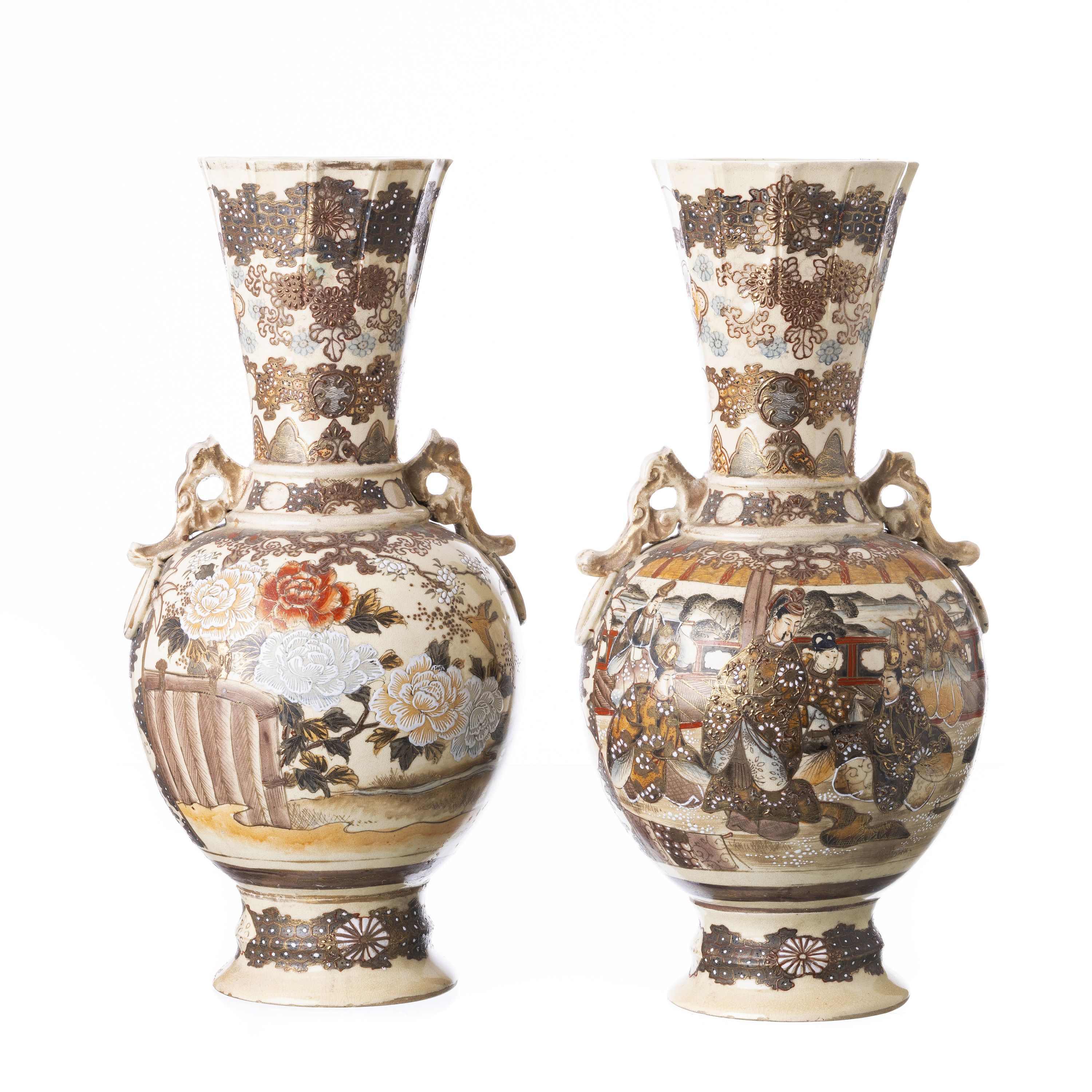 Japão, período Meiji, cerâmica de Satsuma, rica decoração polícroma e a ouro, representando e figuras em paisagem, marcadas na base. Craquelê, uma com pequeno defeito e cabelos. Dim.: 45 cm.
