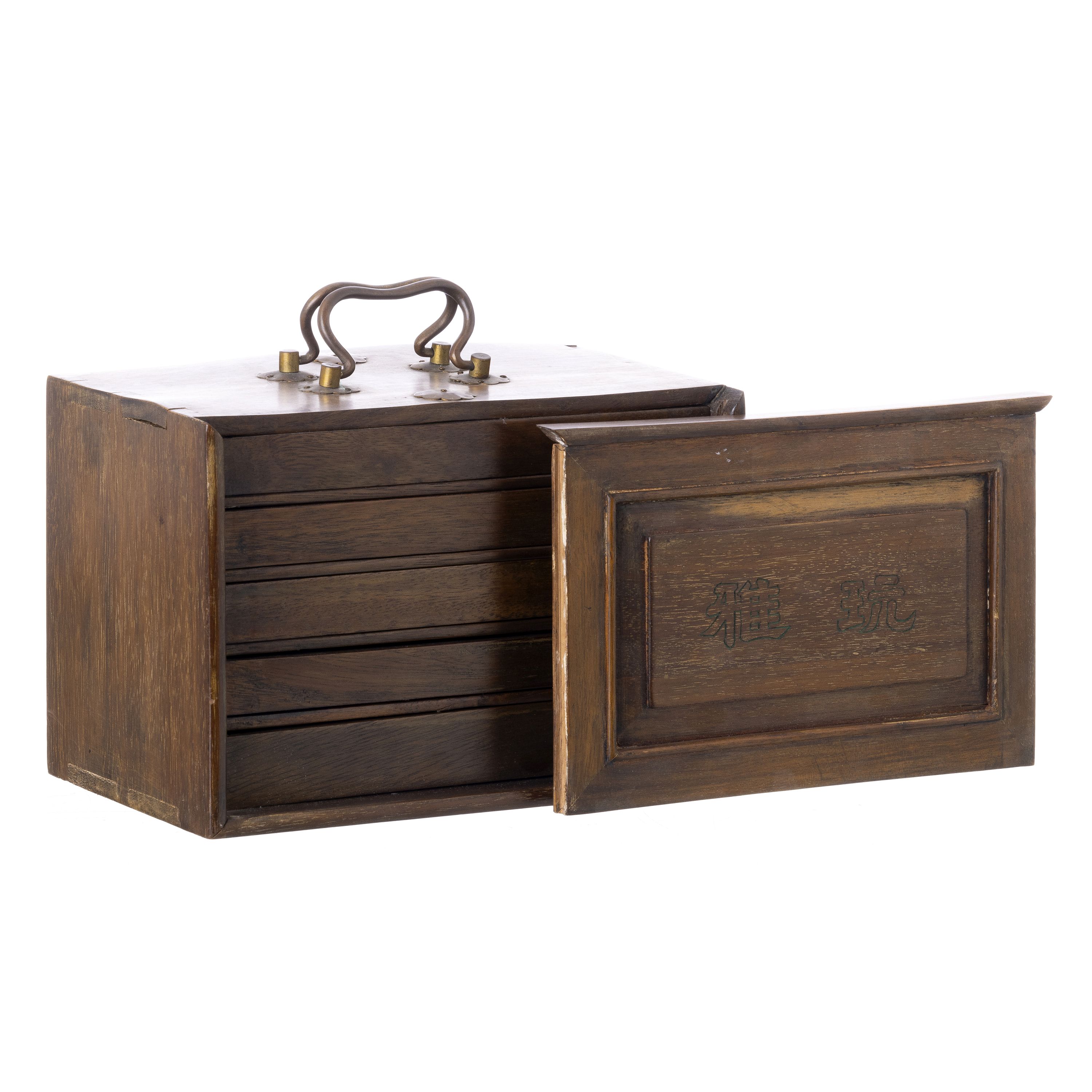 China, séc.XX, em madeira exótica, com cinco gavetas, ferragens em metal. Dim.: 16x23,5x14,5 cm.