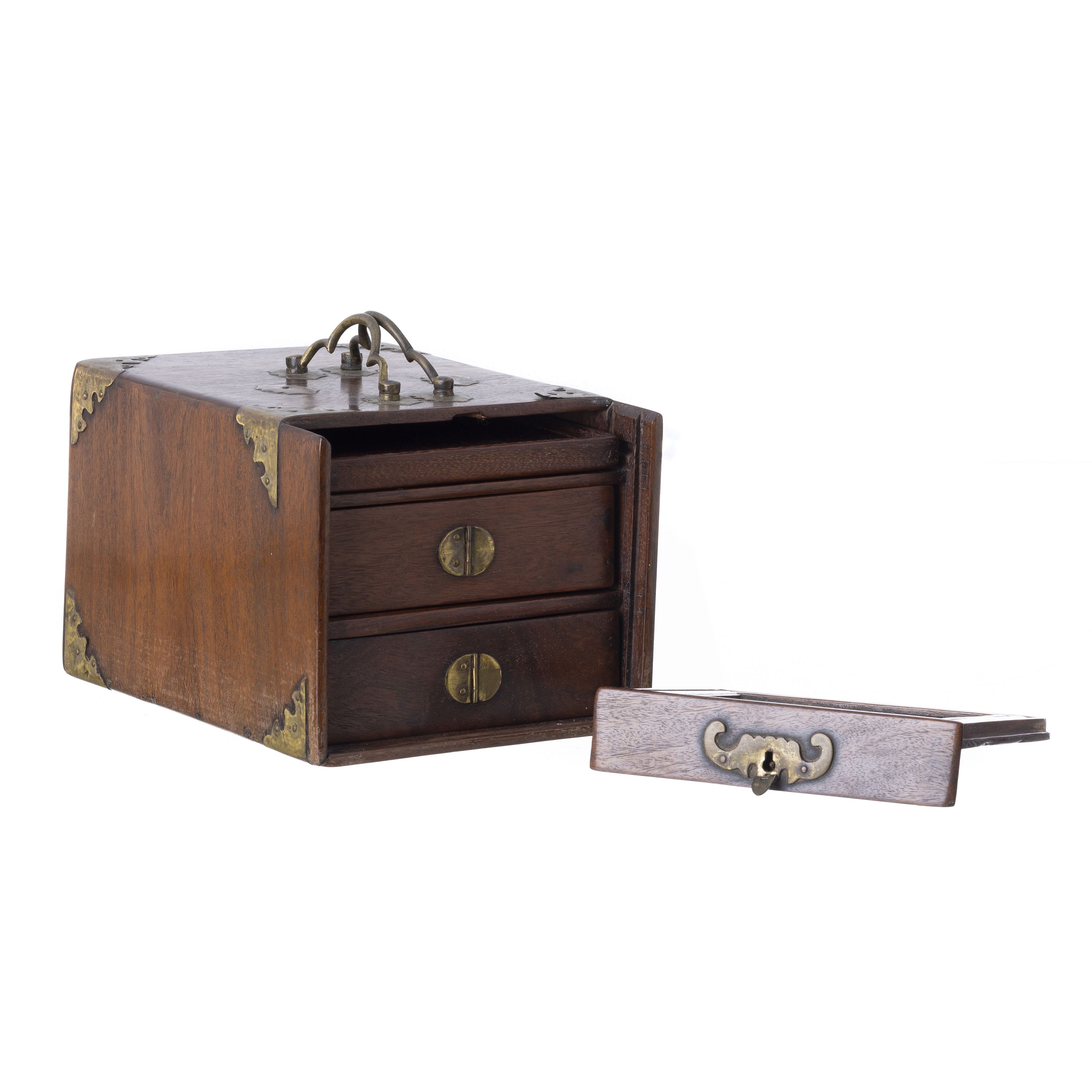 China, séc.XX, em madeira exótica, com duas gavetas e espelho basculante, ferragens e pegas em metal. Dim.: 15x24x17 cm.