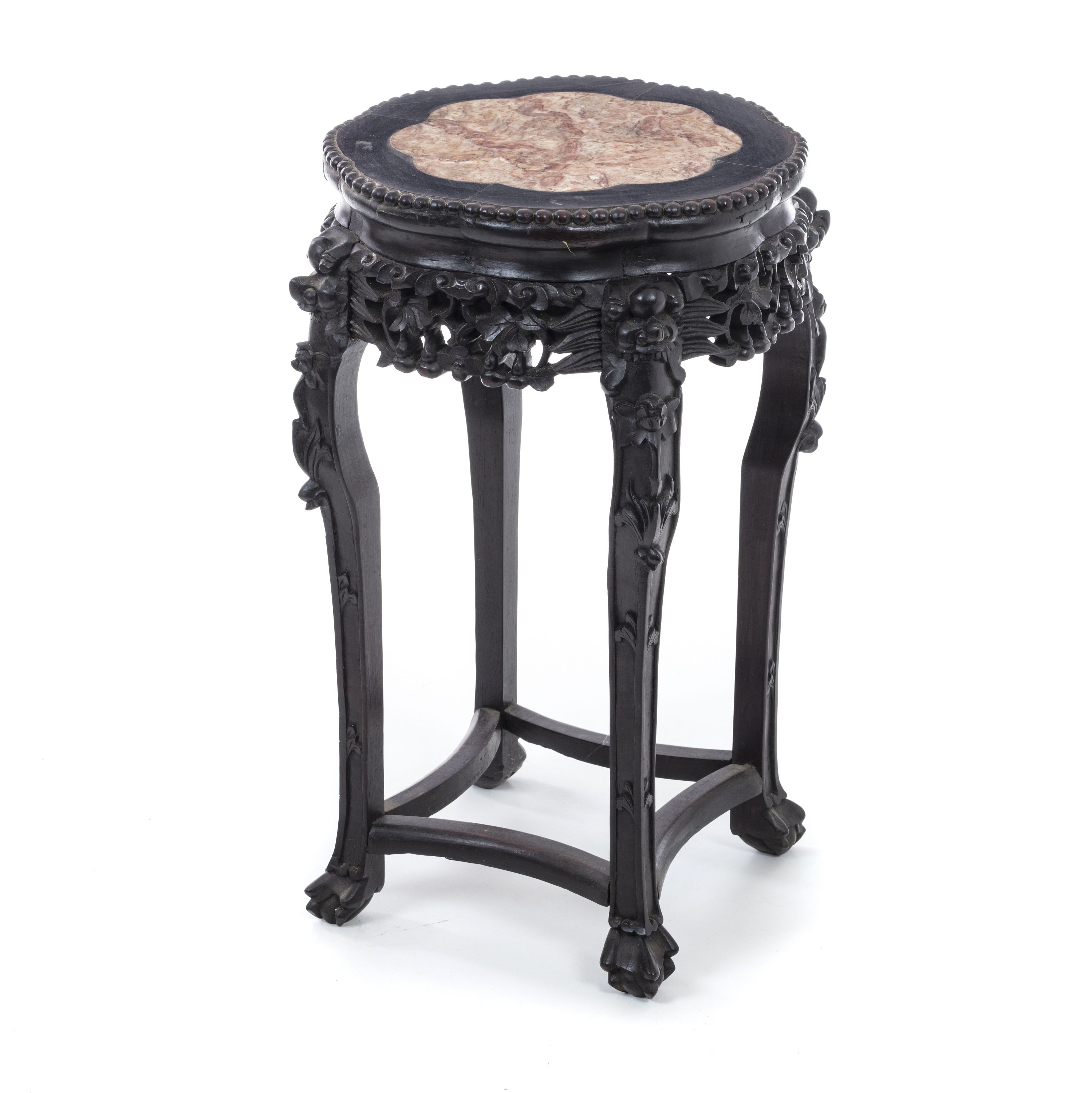 China, Minguo, tamarindo entalhado com motivos vegetalistas e frutos, tampo com mármore. Sinais de uso. Dim.: 59x38 cm.