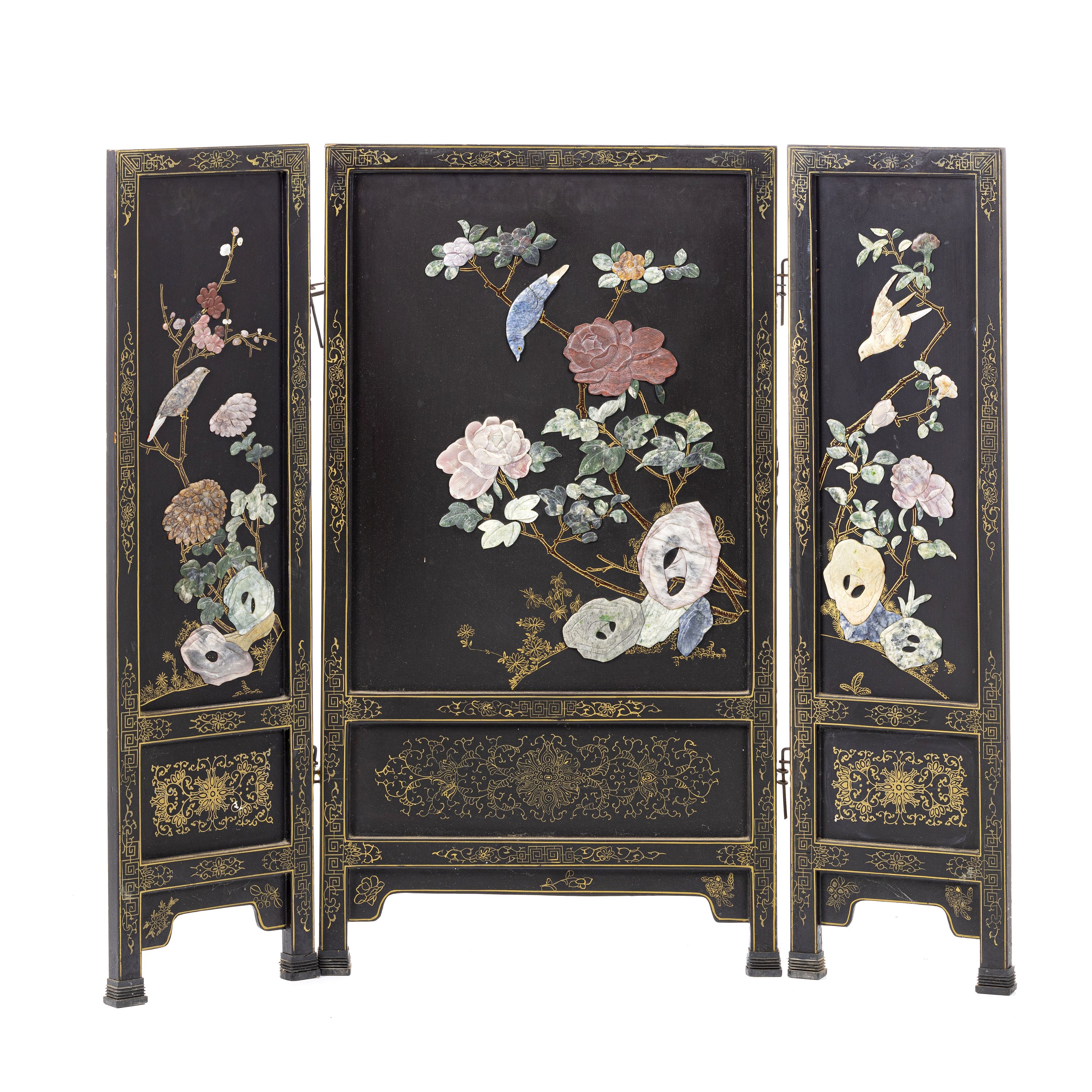 China, República, dois painéis, parte de biombo, em madeira lacada a negro e ouro, embutidos em pedras duras polícromas com aves e flores. Sinais de uso. Dim.: 92,5x102 cm (total)