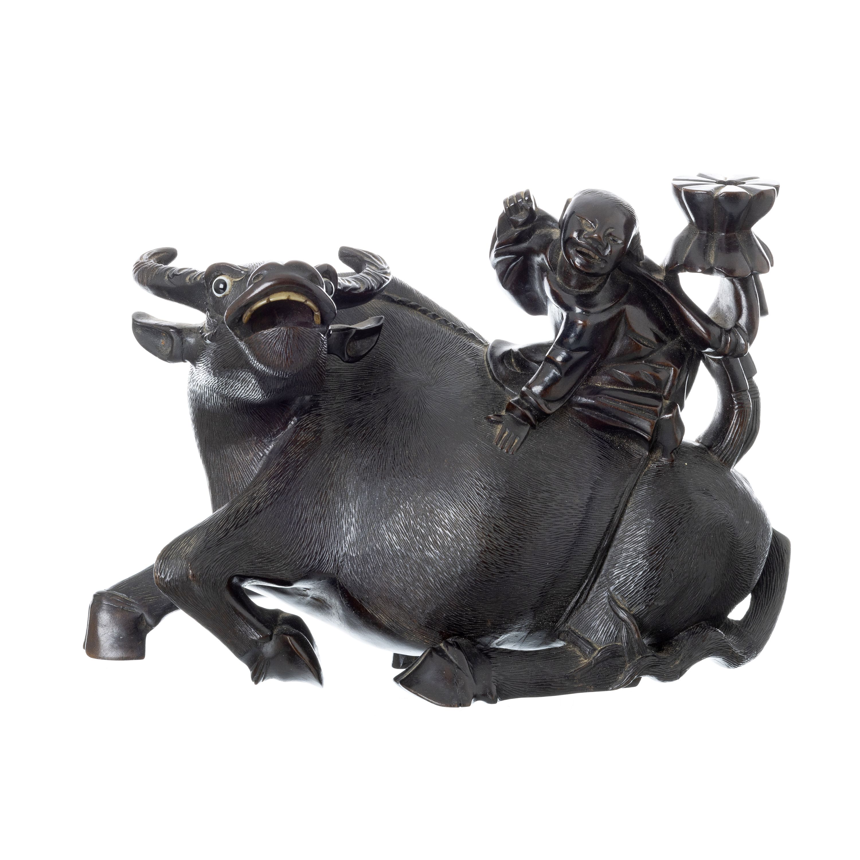 China, Minguo, madeira entalhada representando menino com búfalo. Duas patas partidas e coladas, sinais de uso. Dim.:25cm.