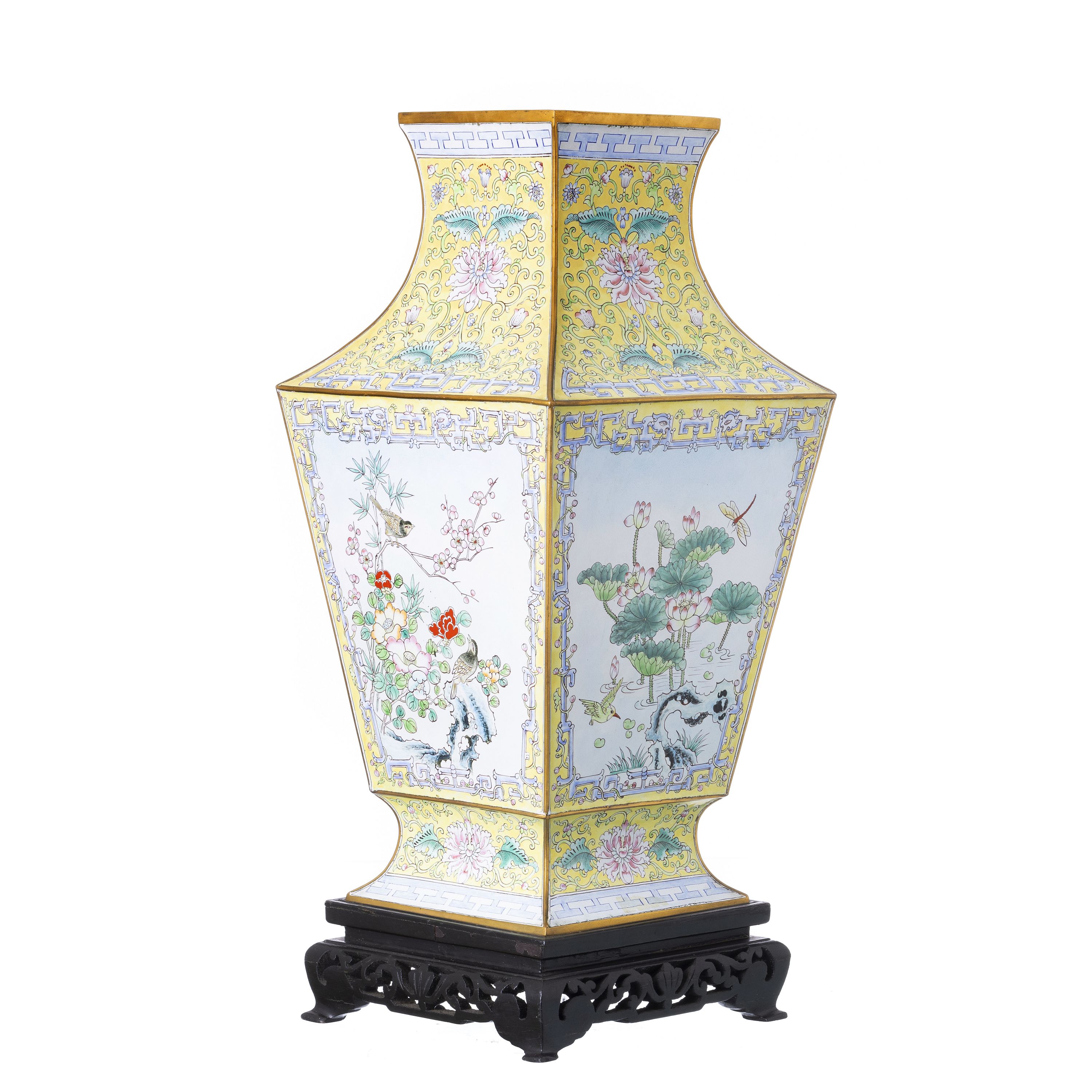 China, séc.XX, em metal com decoração polícroma a esmaltes de Cantão, de reservas com aves, insectos e flores, fundo de enrolamentos de lótus, base expositora em madeira entalhada. Sinais de uso. Dim.: 59,5 cm.