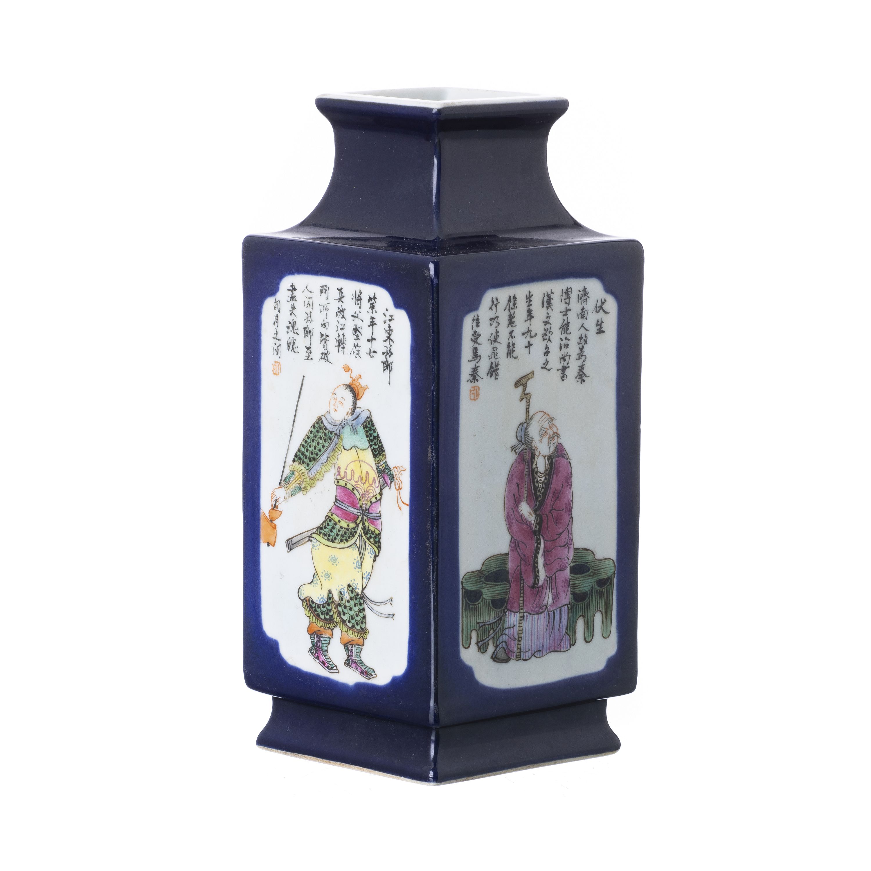 China, séc.XX, decoração a esmaltes polícromos e rouge de fer, com reservas de figuras e caracteres, sobre fundo azul. Marca na base. Sinais de uso. Dim.:22cm.
