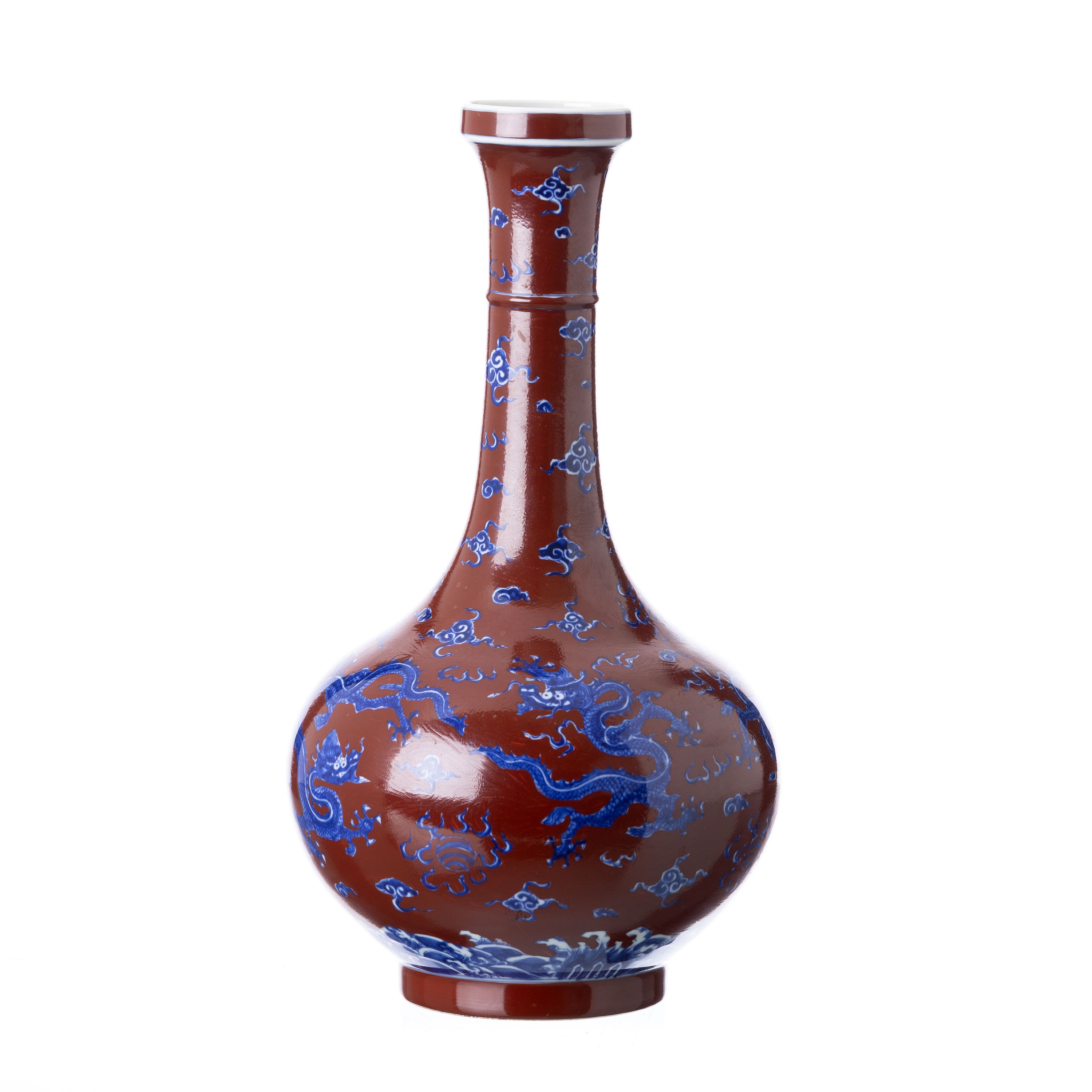 China, séc.XX, decoração polícroma e a esmaltes, de dragões entre nuvens sobre fundo sangue de boi. Marca na base. Sinais de uso. Dim.:36cm.
