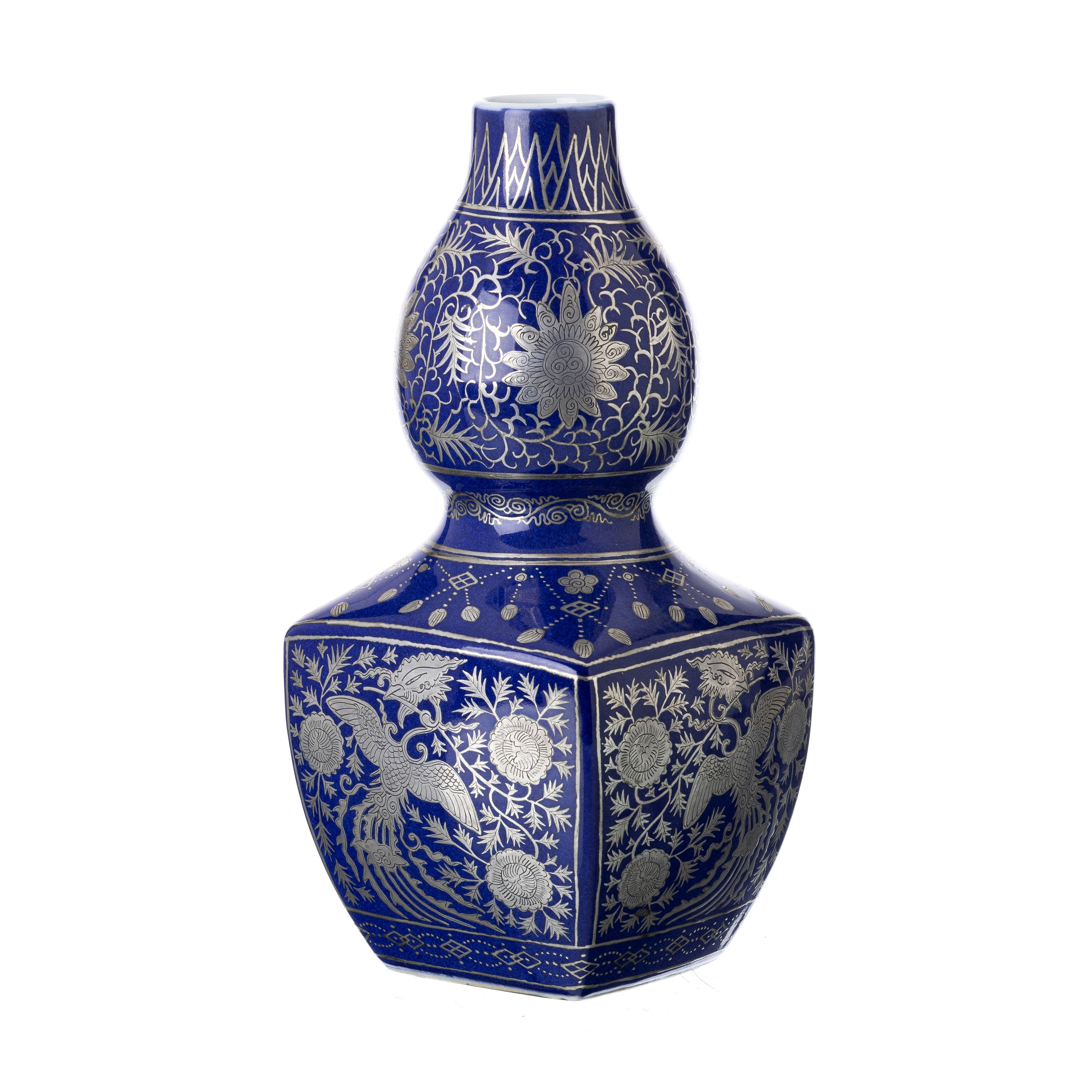 China, séc.XX, porcelana com decoração com inclusões em prata com fénix, flores e lótus, fundo em azul cobalto. Marca na base. Dim.:25,5cm.